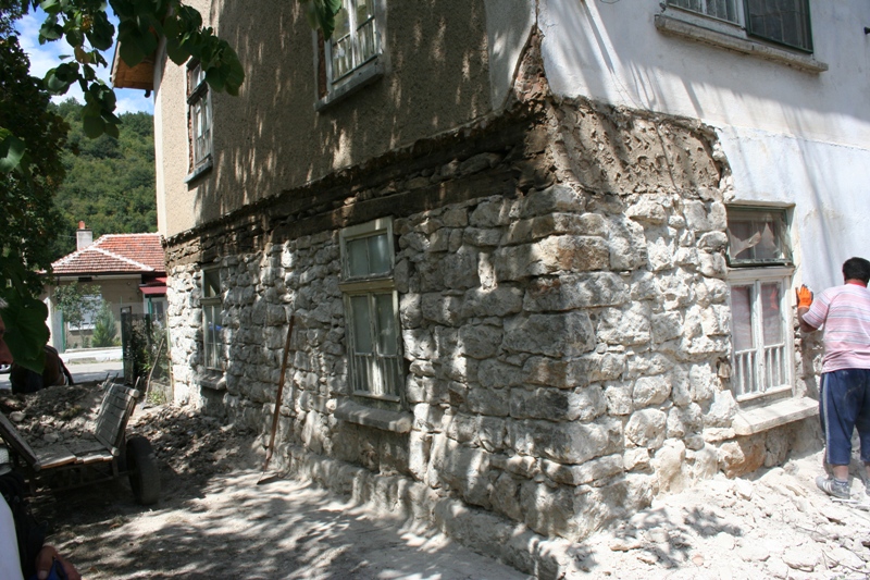 Оказа се, че по фасадата са правени известни промени, на някои от които аз съм присъствал като дете, за други не знаех, ама в резултат на всичко това каменният зид беше нарушен на някои места. Една от вратите беше станала прозорец, друга е била по-широка и още няколко други подобни промени, за напасването на което естествено се е зидало с тухли за по-лесно. Тези петна грозяха цялата къща и трябваше да се вземат съответни мерки. Тези така наречени мерки включваха единствено възможният вариант – разходка до близката местност, откъдето на времето добиваха камъни за строеж и търсене на плочи, които поне що годе да приличат на оригинала. После ъглошлайф, диамантен диск прахуляк и всичко от този род. На що змия се наруши спокойствието и как успяхме да се опазим от тях направо не ми се разправя...