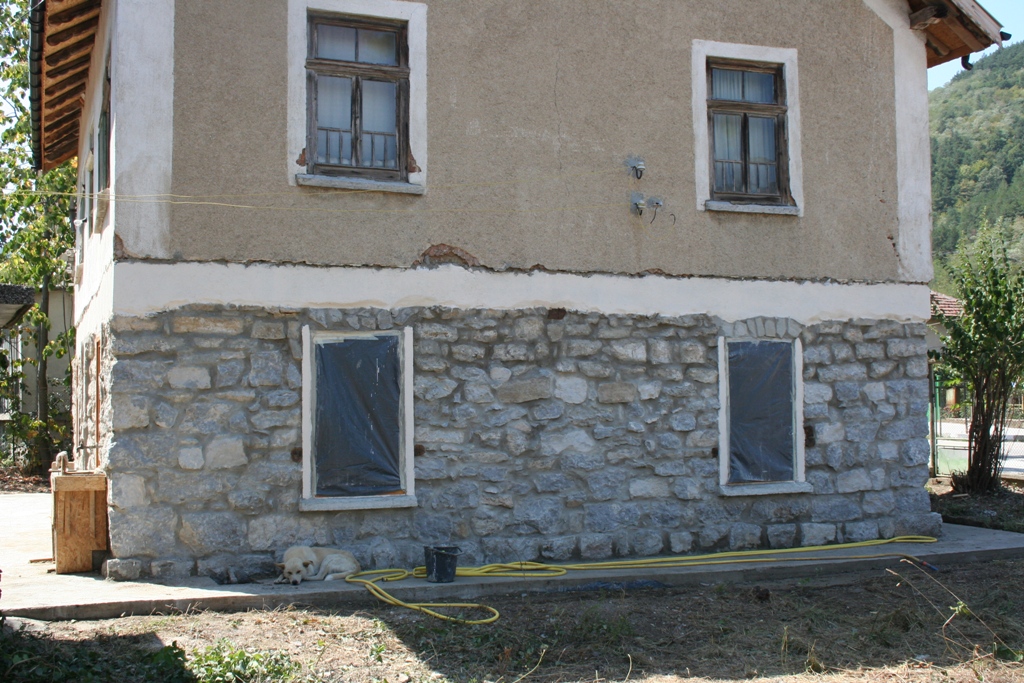 Наложително беше да се предприемат мерки за спиране на влагата и някакъв вид мазилка на стените, които съвсем бяха заприличали на разплетена кошница. За влагата ми беше що-годе ясно – отвеждане на водите далеч от къщата, премахване на всички градинки около стените, в които растяха всевъзможни буренаци и поне 1 м бетонни пътеки околовръст.