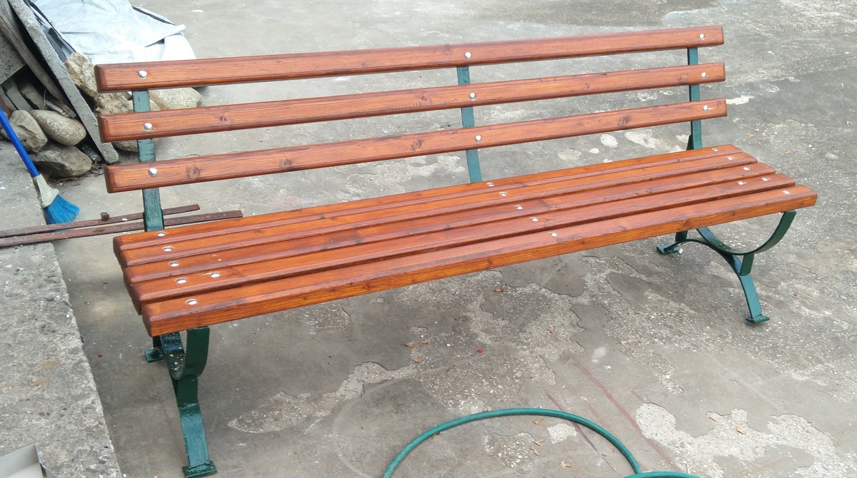 Иначе и аз преди две седмици някъде се правих на майстор и възстанових една такава за в двора. Уж материала беше сух и го импрегнирах преди това добре с масълце преди лака ама ще видим. Иначе имам още два комплекта железа ама за тях съм се замислил да ползвам и аз едни стари кофражни дъски и да ги слепвам но ще е догодина. Тъщата не заслужава повече екстри.