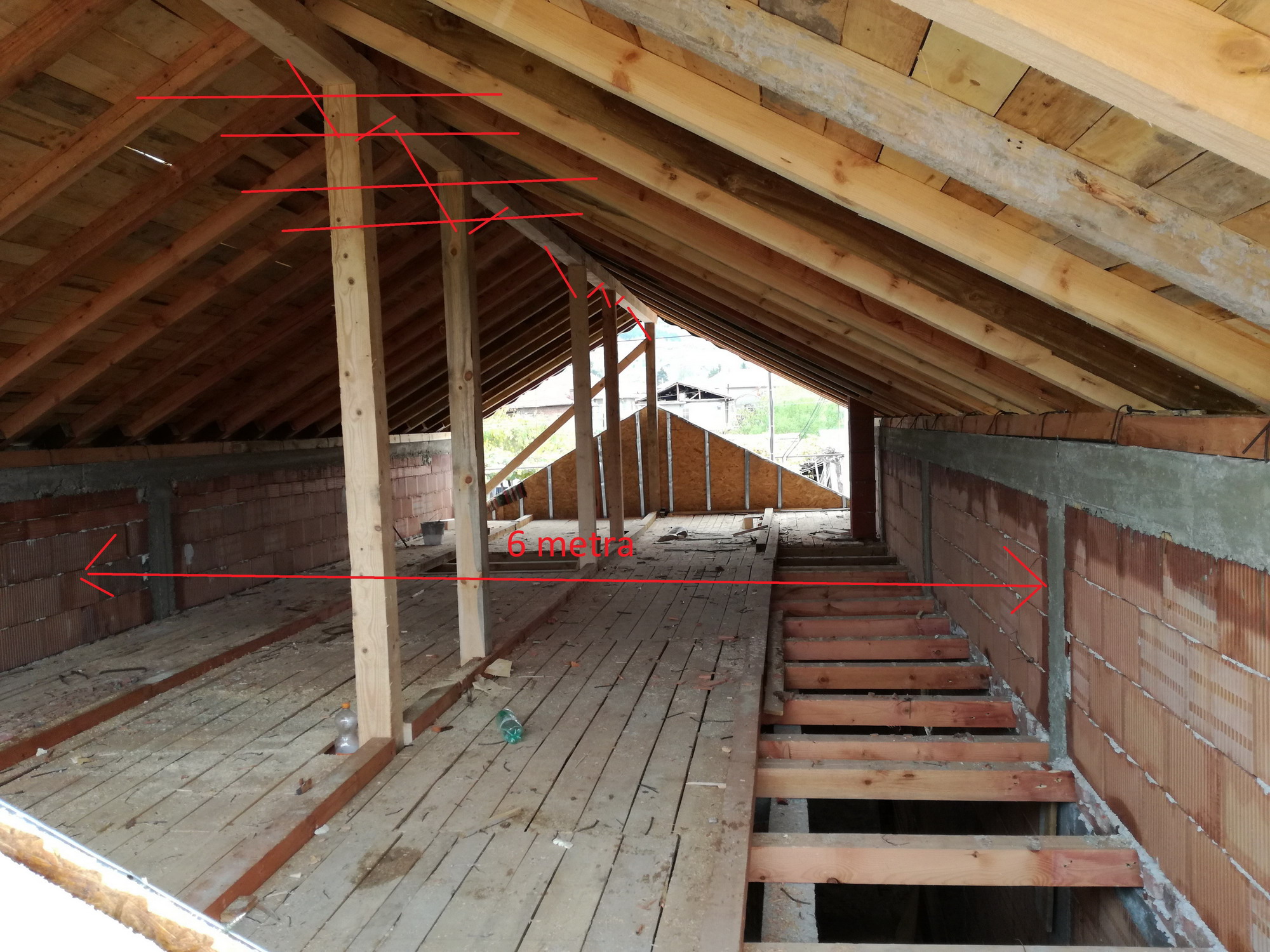 Работата отива на няколко стоманени греди над тавана, хоризонтални и стъпили върху зидовете. Хем ще носят покрива, хем ще можеш да закачиш за тях провисналия таван и ще можеш да складираш горе тежки джунджурии.