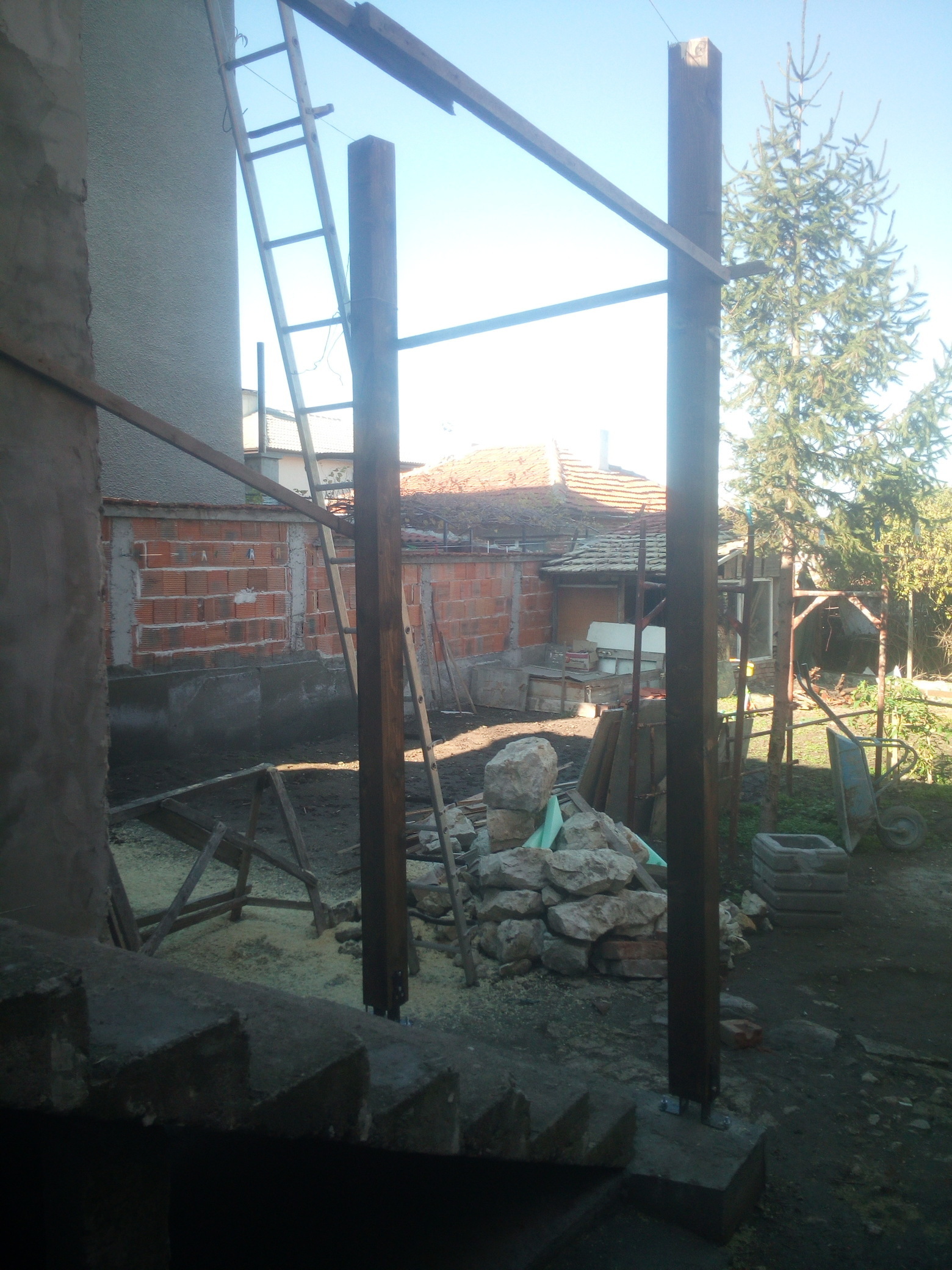 Ама и майстори, ръцете си оставили на оградата. От последната снимка ще добиете представа къде искам да направя тераса, за сега съм се ориентирал да е от дувара до другия ъгъл на къщата до външните стълби и да кажем 3м. на зад към двора. Това се пада на север и за сега си мисля, че няма да е много удачно да я покривам и от горе като чердак и не че не искам, но си мисля постоянно ще е сянка, а ако я оставя открита и поставя на стената под керемидите закрепена тента или как му казват дето при нужда се разпъва /Дъжд, Слънце/ и когато не е нужно се прибира към стената. Няма да е много красиво, но може би функционално? П.П. относно външното стълбище вече съм го покрил с навес и в бъдеще мисля да затворя, но за това по на там ще стане въпрос.