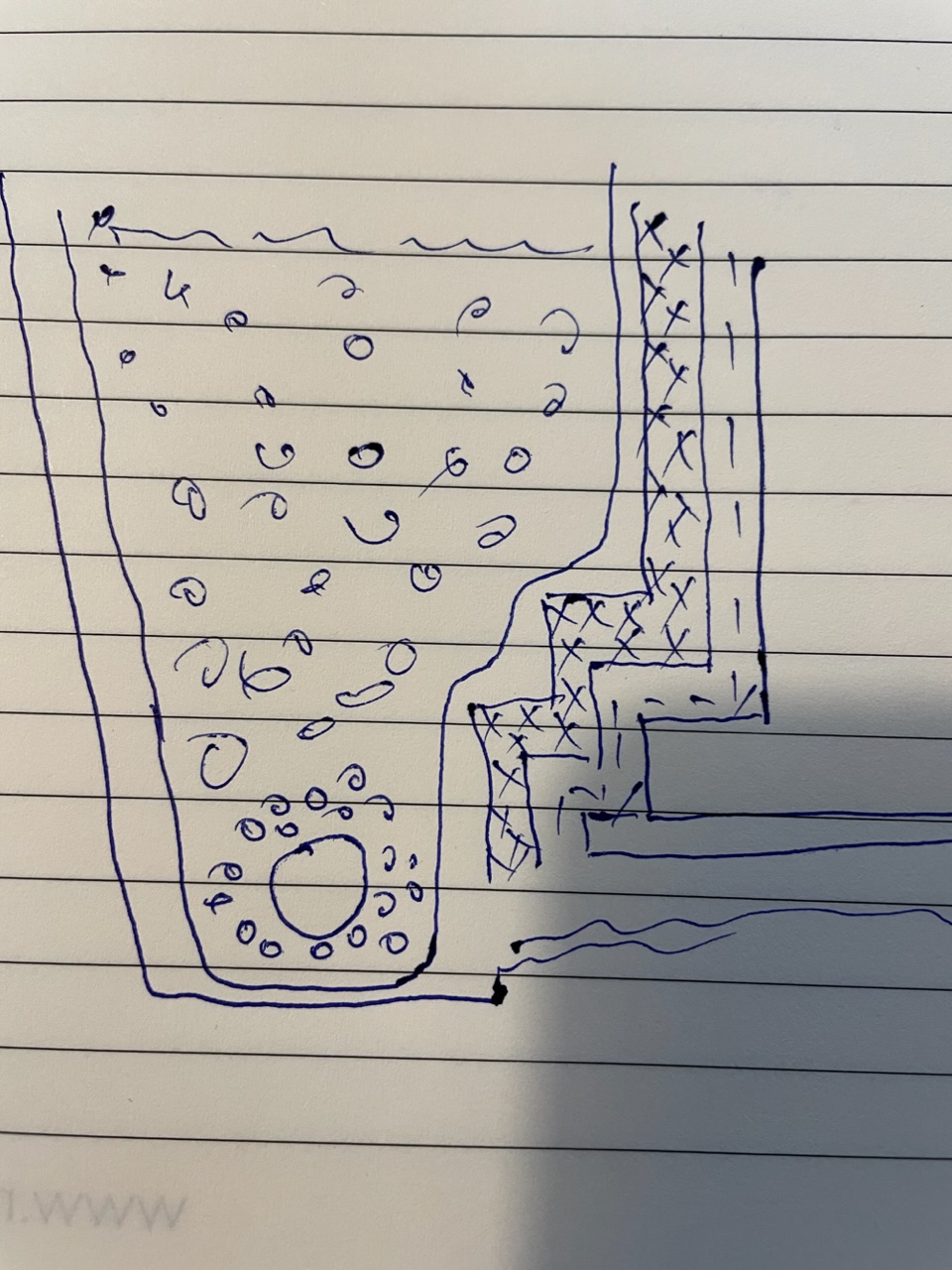 Като твоята втора, но само откъм стената и подвита хоризонтално над тръбата/чакъла.