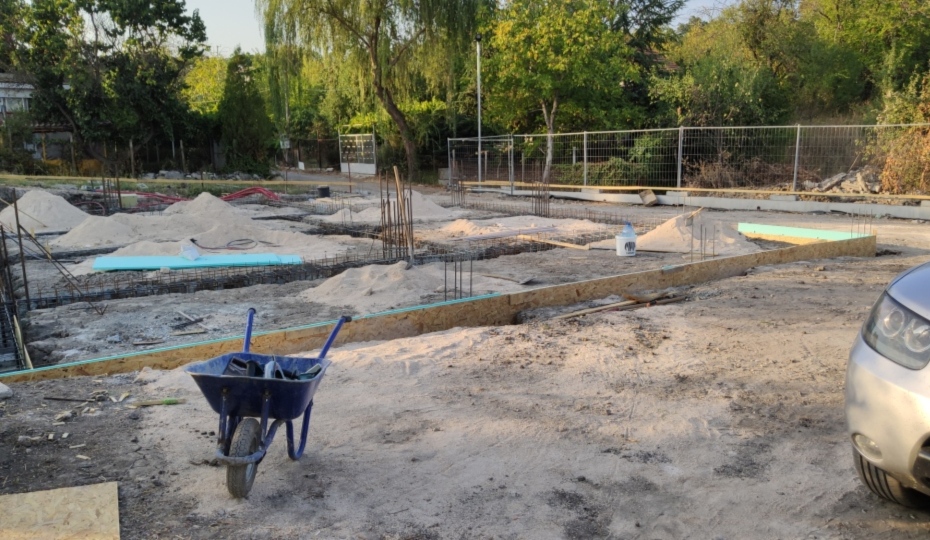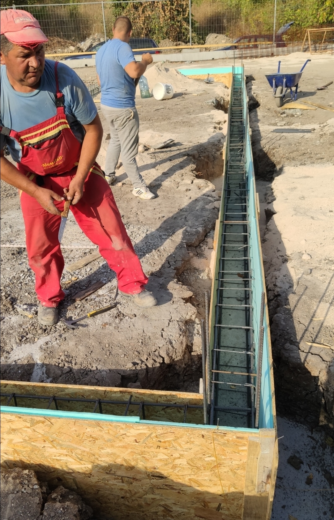 Бързам доколкото може, с по-малко компромиси.. :-D Излязохме от най-опасната зона от обрушването на стените на изкопа с минимално замърсяване на бетона при отливането на стъпките и първите 50см от основите, където бяхме без кофраж.. Прахосмукачката ми едвам издържа.. :lol: Идеята ми да комбинираме осб и фибран вместо кофраж е много практична, защото в крайна сметка се балансира като разходи спрямо бетона, а има и няколко други плюса.. Оставащия кофраж ще изгние, а фибрана си е изолация на основата и стените от кота -83см и вече няма да имам пръст в пояса. Бетона е учудващо добре като консистенция и плюс добавката и вибратора в ивичните, мисля, че ще е як.. Използвам мрежата на ивичните и биглите на рандбалките за опора на лентовите дистанционери 15ммм, понеже във фибрана "пеперудките" потъват и не ми вършат работа.. Работа върви доста бързо и утре подравняваме нивото под плочата, Арматурата ще я навържат бързо, но зависим от доставката на материала за подравняване и разнасянето му, ако успеем утре. Реално, ако се напънем, можем да излеем едновременно пояса заедно с плочата, общо около 40м3 в петък преди дъжда, но започвам да се преуморявам, понеже втора седмица работя без почивка и може би ще го оставим за понеделник, че бързата кучка.. :cool: :partyman: