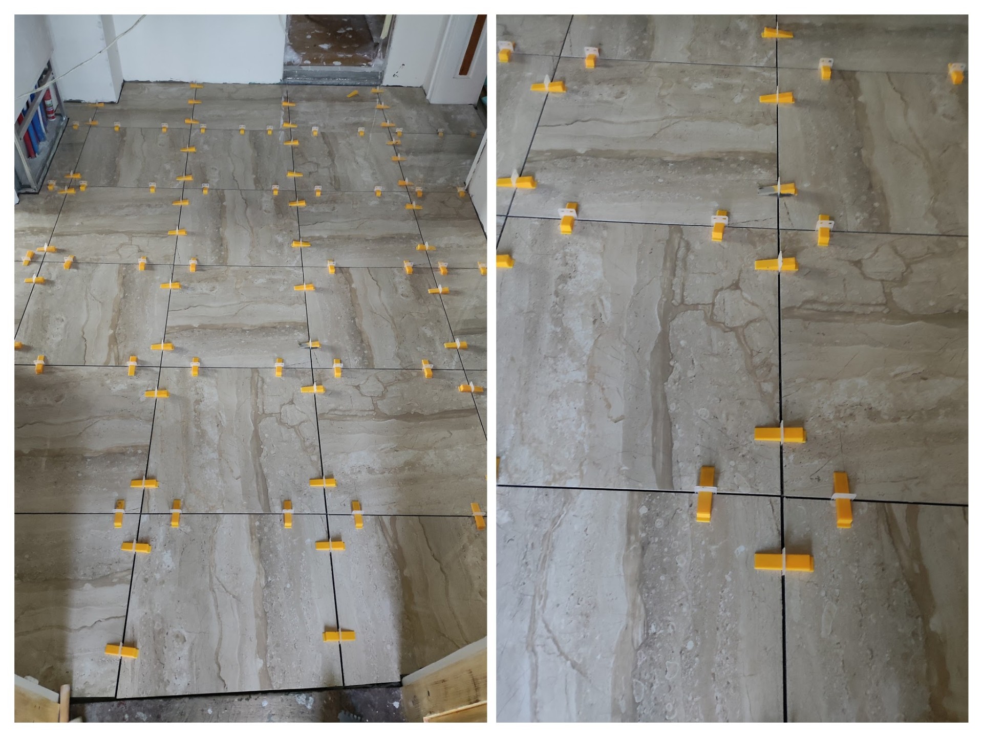 Лепилото пак Мапей, грунда синия. С гребен 10ка работих. Първо бях намислил да обмазвам и плочките, но след втората се отказах.