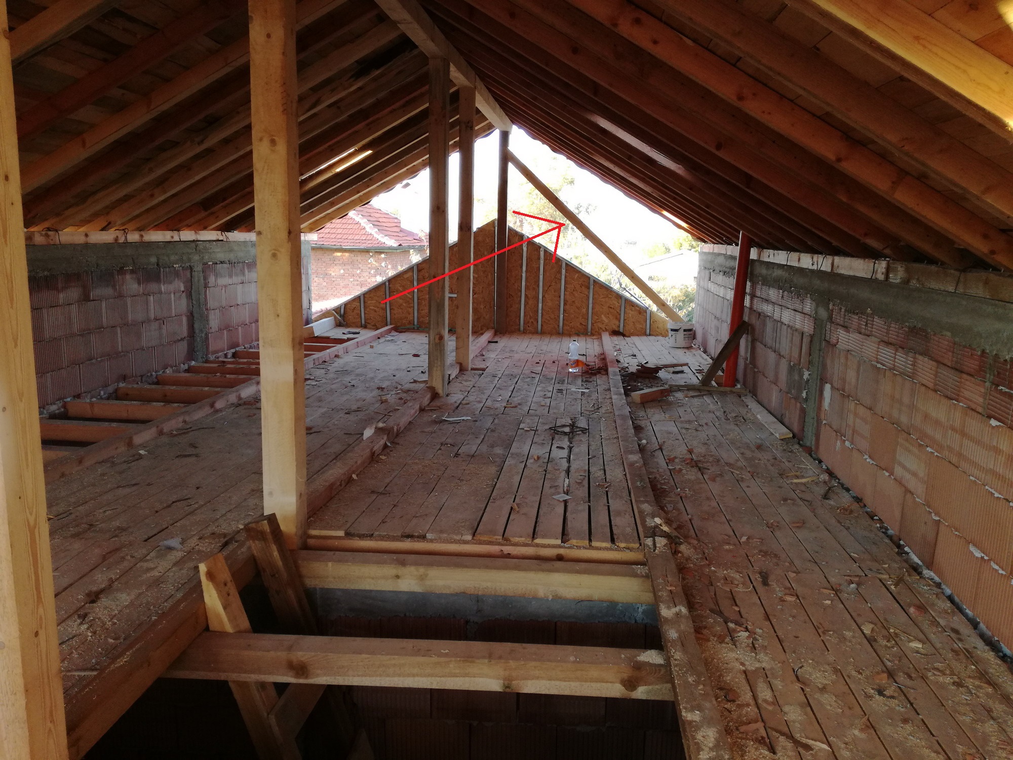 Ето малко повече снимки, за да може да прецените ситуацията. Както споменах, единия скат продължава над верандата. В двата края от страната на дългия скат са оставили по една греда (маркирал съм я в червено), която ми казаха, че е като противоземетръсна мярка.