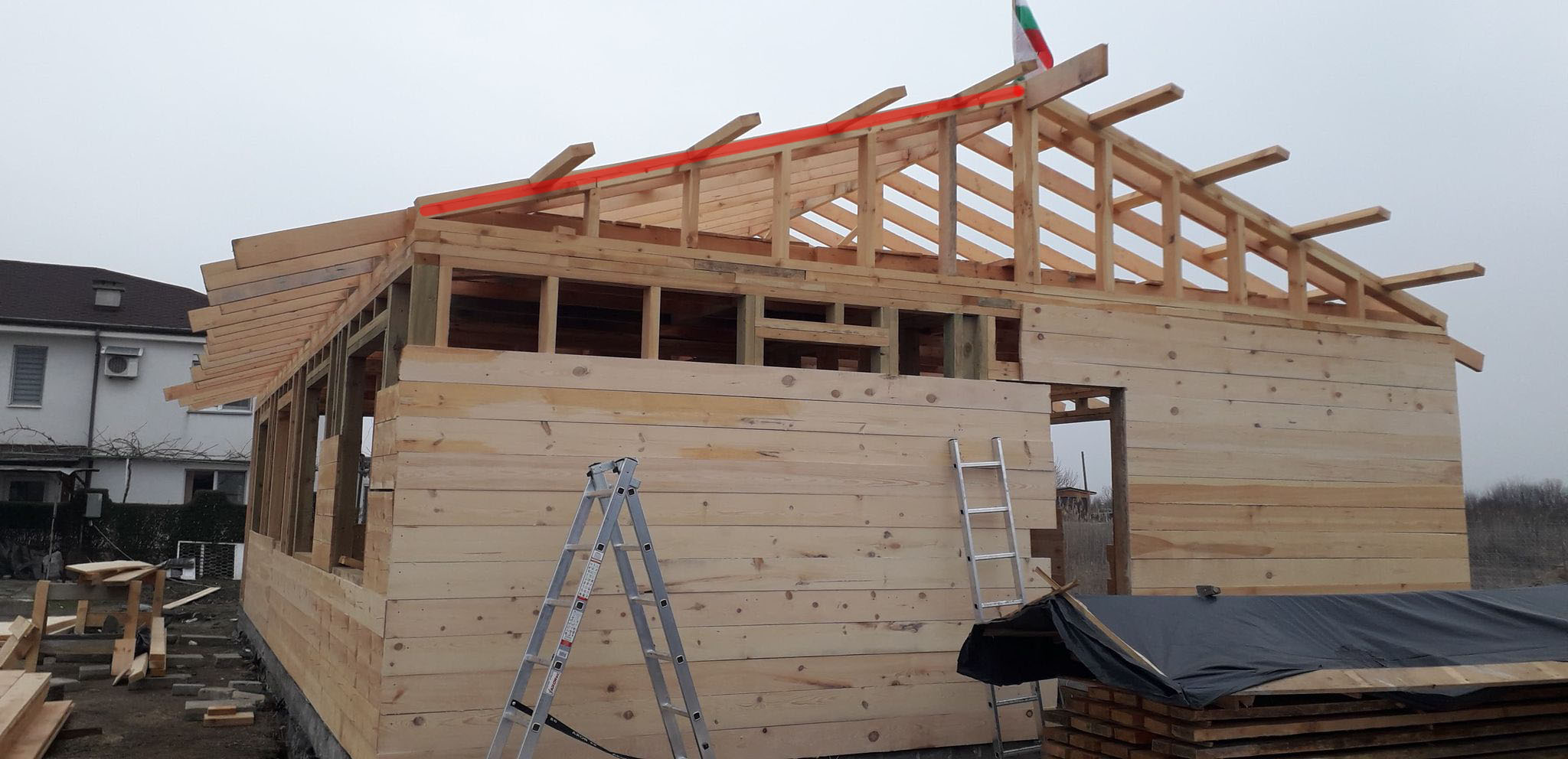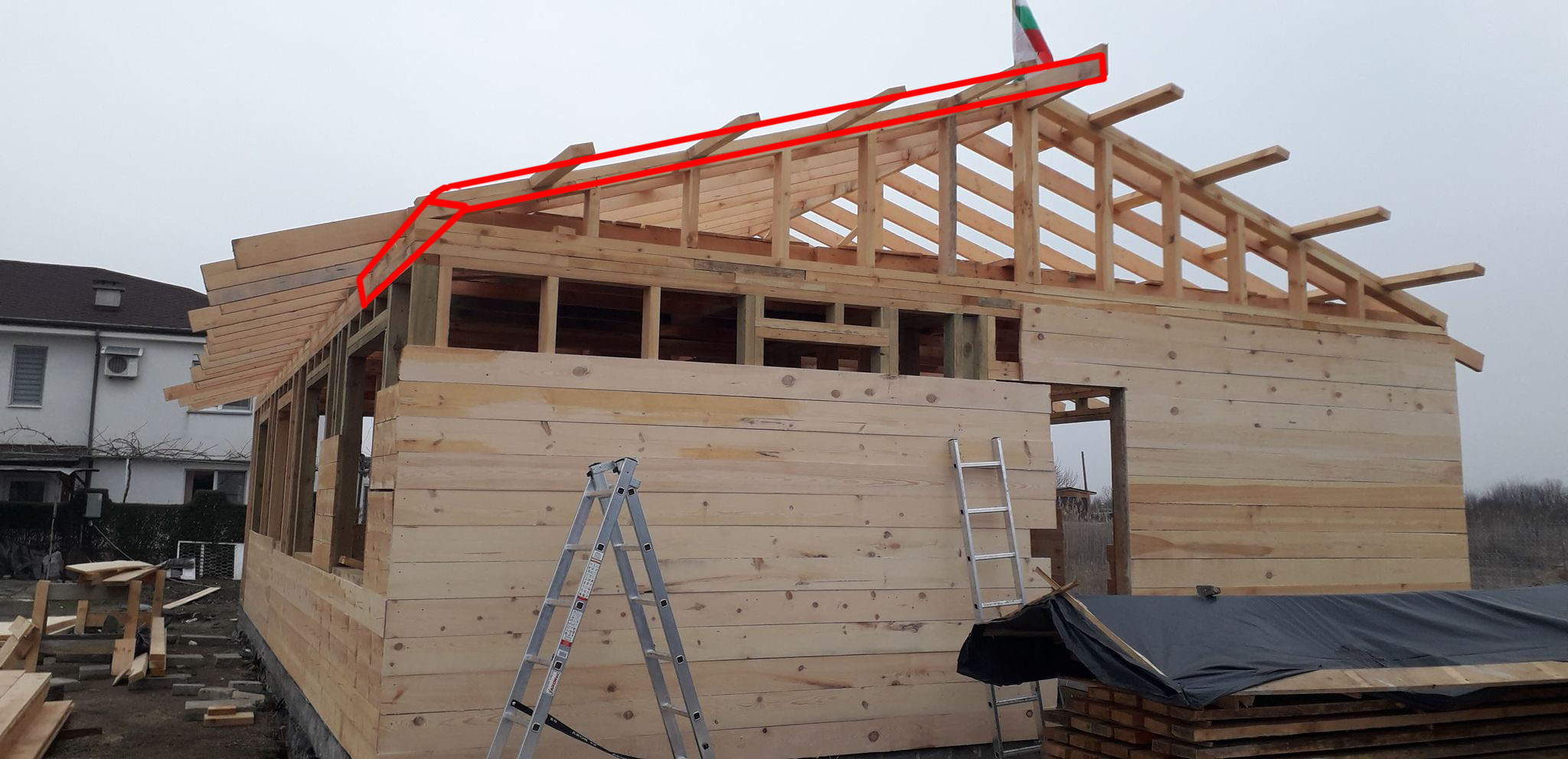 пон фев 22, 2021 12:11 amPIP написа: Аз бих махнал двете горни подложни дъски с дължина поне 1.5м (три ребра) и на тяхно място сложи цяла греда (ако я обличаш може и две дъски, но на обратно), която я пусни да надстърча.Това не го разбрах. Значи махам тези двете горните които съм почервенил, и на тяхно място слагам цяла греда. Ами за стрехата столиците къде ще отидат?
