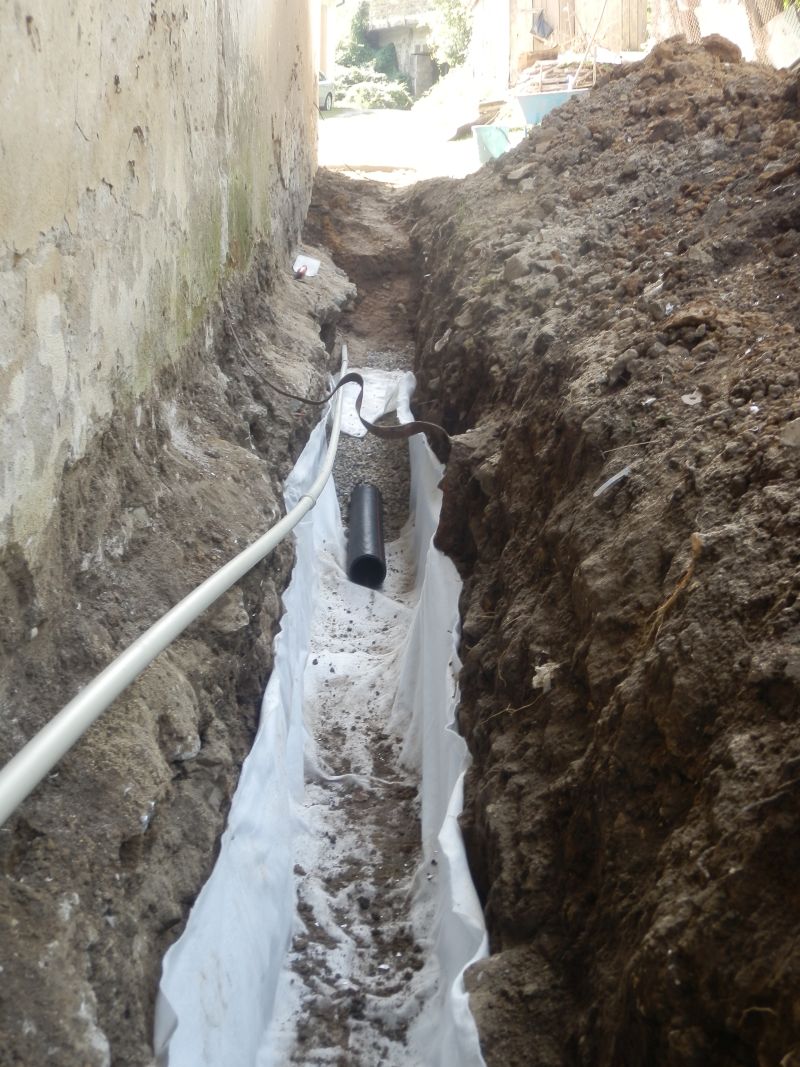 Вчера го докарах до събирателната шахта, оттам вече е лесно - само тръба за отвеждане. Счупихме се от бързане двама човека 5 дни, да изпреварим дъжда. Сега го заравям на това положение, че прогнозата е кофти, да не ми напълни трапа с вода, че е до основите, а те вече веднъж са поддавали през годините и стената се е пропукала около ъгъла на постройката
