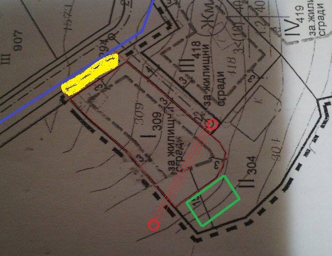 радвам се за куража. Не знам кой какво ти е казал за някякви жици, но доколкото мога да чета планове, предвидено е в новоотворената улица да се монтира стълб - отклонение от основната въъздушна улична мрежа ниско напрежение. Тази мрежа се изгражда по тротоарите и предвид посочената пунктирана линия не попада в рамките на имота ти. А посочените граници на застрояване са три метра навътре в имота. Така че няма как да се налага ограничение по височина. А сервитута на електропровода определено не се нарушава.