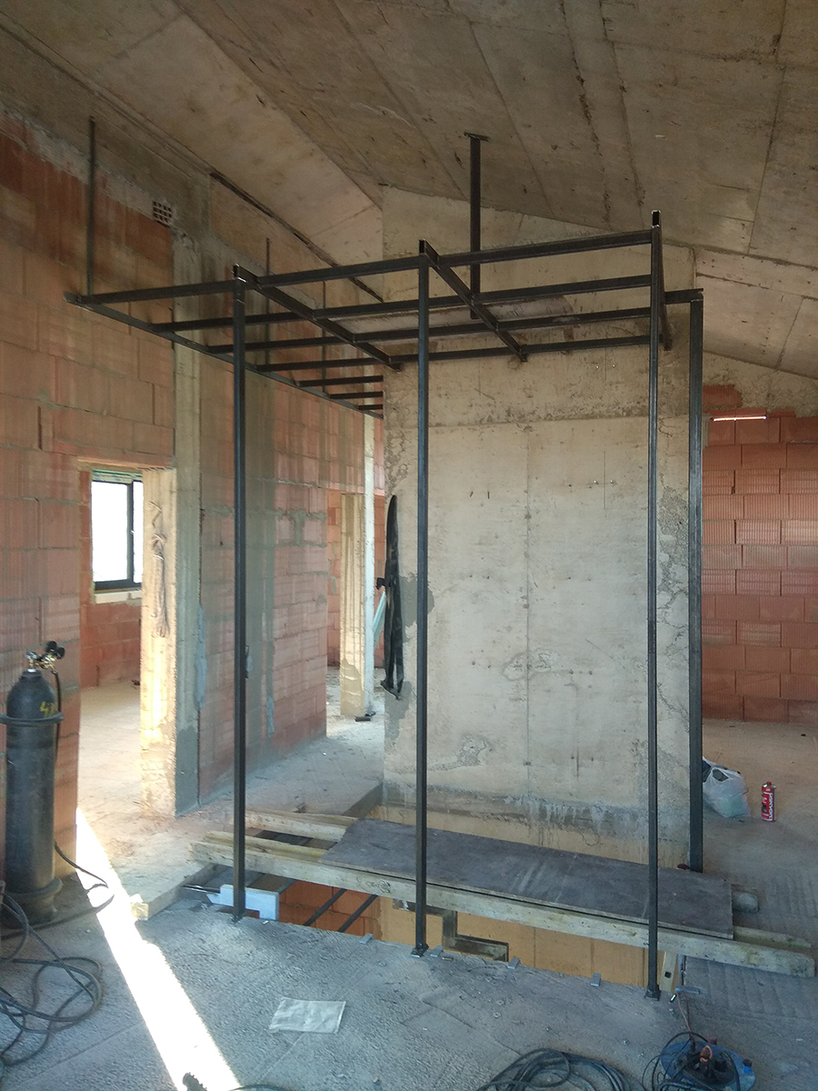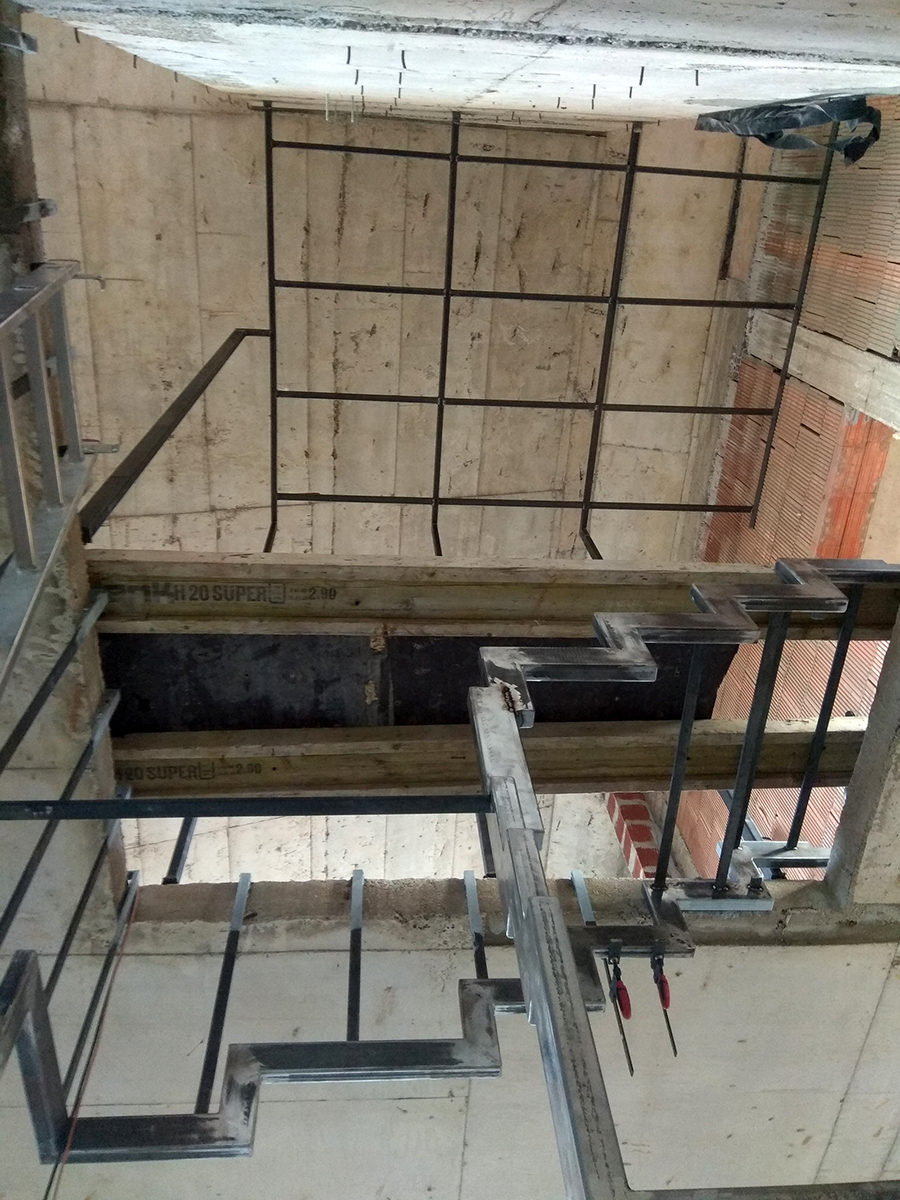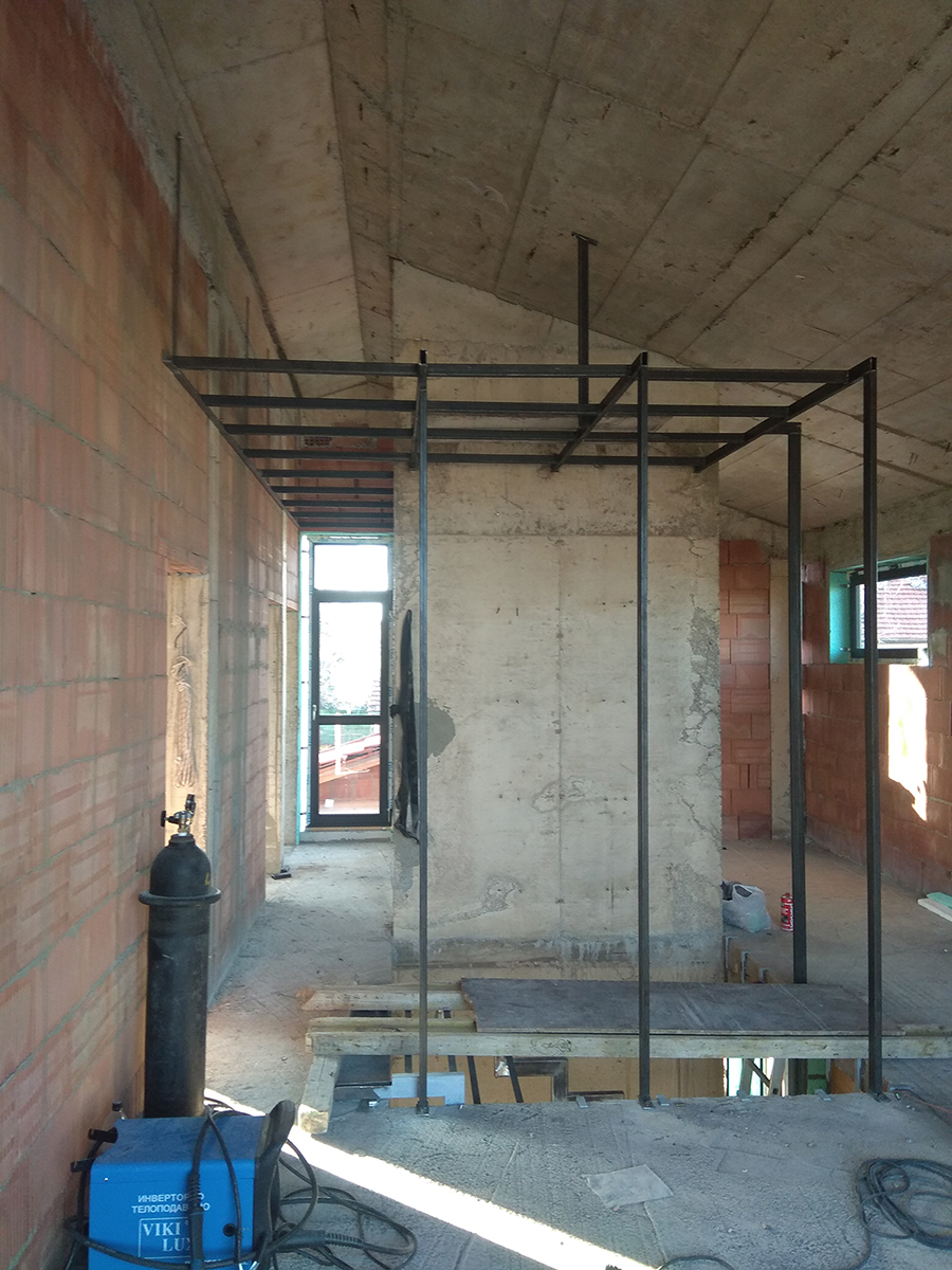 Разкарах дървената стълба от две греди 10-ки и стъпала от кофражни дъски и подкарах „ажурната стълба“ по мой проект. Оказа се интересна задача, тъй като съчетава и правоъгълни и вити участъци. В проекта имах бройката, височината и дълбочината на стъпалата. Минах през различни варианти за конструкцията и в крайна сметка се спрях на „рамка“ от метал с дървени стъпала. В някакъв момент, между „рамките“ отгоре и отдолу ще се виждат само дървени стъпала.