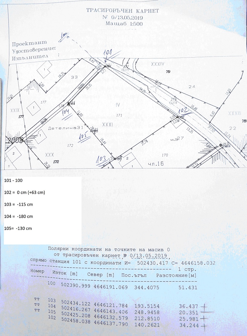 Вчера пак виках геодезистите, да проверят основата за оградата от горния край на парцела, която направих по ориентирите, които бяха сложили, че ме усъмниха, защото ги правиха с отмерване от странични точки понеже се падаха в "сянка" и уреда им не ги "лови", а сега вече разчистих навсякъде и въпреки, че белязах по 8-10см в моя парцел, сега ми сложиха нови колчета, които се падат в канала за основата, който вече направих.. Вчера мериха с оптически уред, а предишния път с електронен и явно резултатите са различни.. Сега взеха, координати от някоя трасировъчна точка наблизо и мериха спрямо нея.. Освен това исках да видя и вертикалната нивелация как е и в крайна сметка нещата вече са по ясни.. Освен това изкоренихме дърветата които бяха останали вплетени в мрежата на оградата към горния парцел и изкопахме канал за основа на новата ограда..уж в моя парцел, но реално на места е на "център между двата по новите граници, макар че визуално е от 30 до 50 см навътре в моя парцел спрямо старите огради, което не знам на какво се дължи.. Геодезиста твърди, че е от заснемането, което се е правило преди и методите му не са били точни.. Не знам дали не можех да поискам пречертаване на границите по реалните огради, но вече свърши..