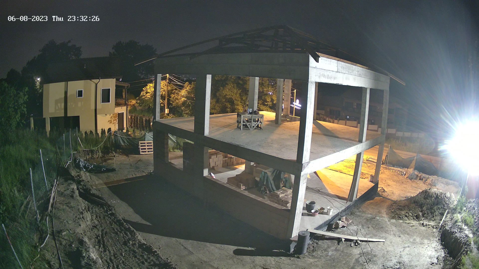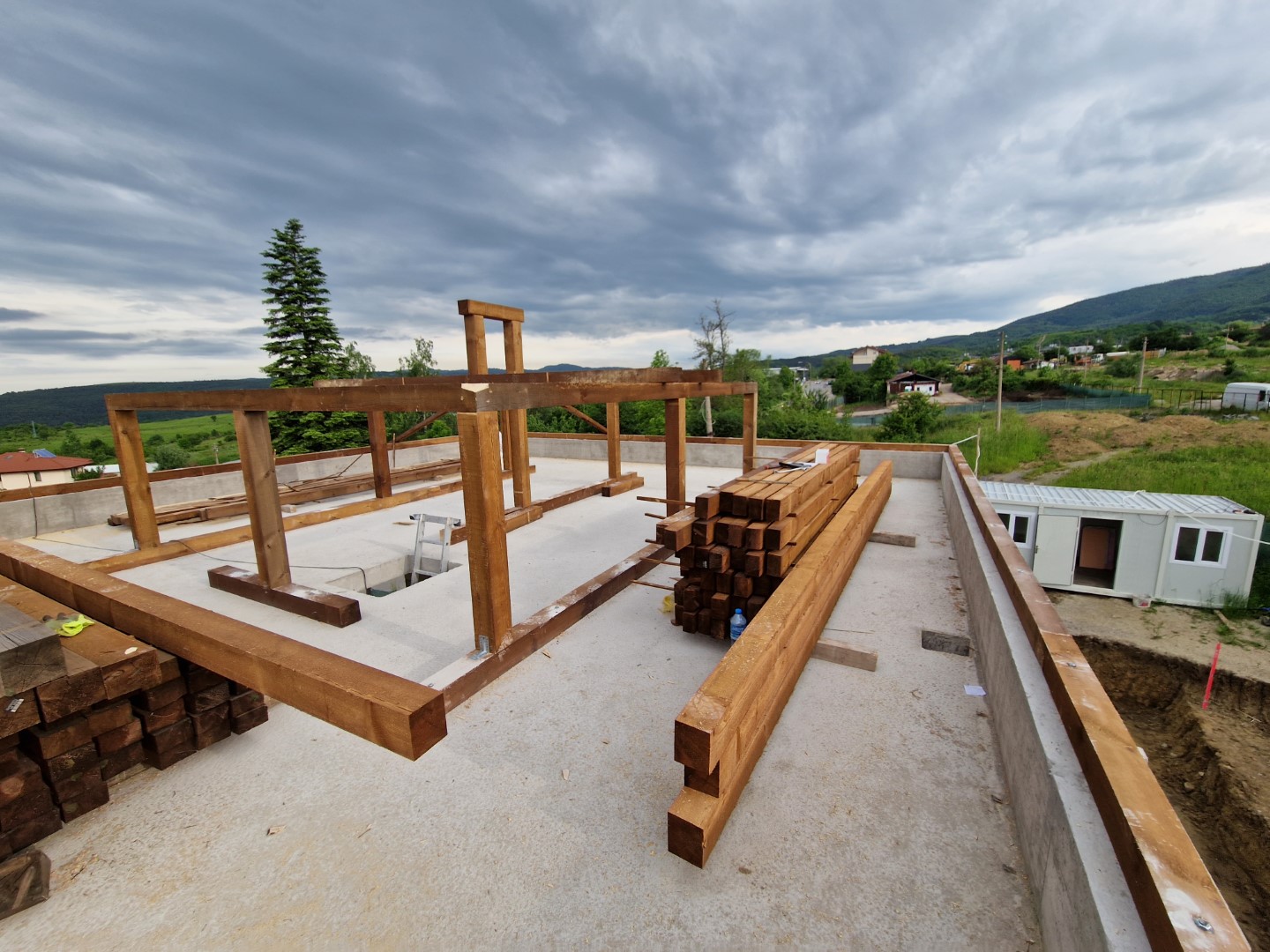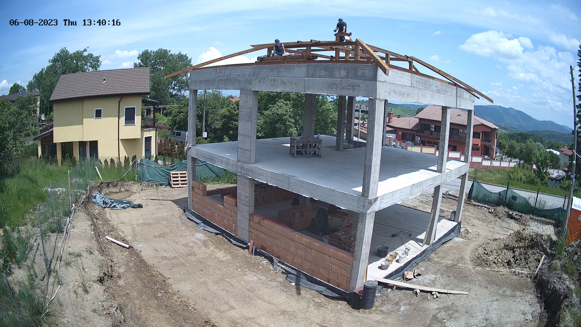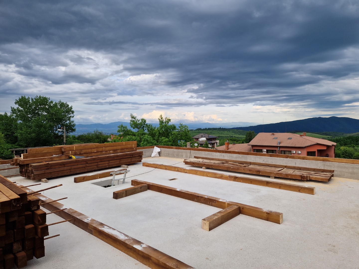 На 05.06 дойде фирмата за покрива. Започнаха да разчертват и да замерват нива и т.н. Дойде и материала за конструкцията и го качихме с кран на плочата. Момчетата казаха, че борда и плочата са перфектни и има съвсем леки отклонения в рамките на милиметри. Като цяло казаха, че рядко попадат на подобни обекти и, че трябва да похваля строителя:)