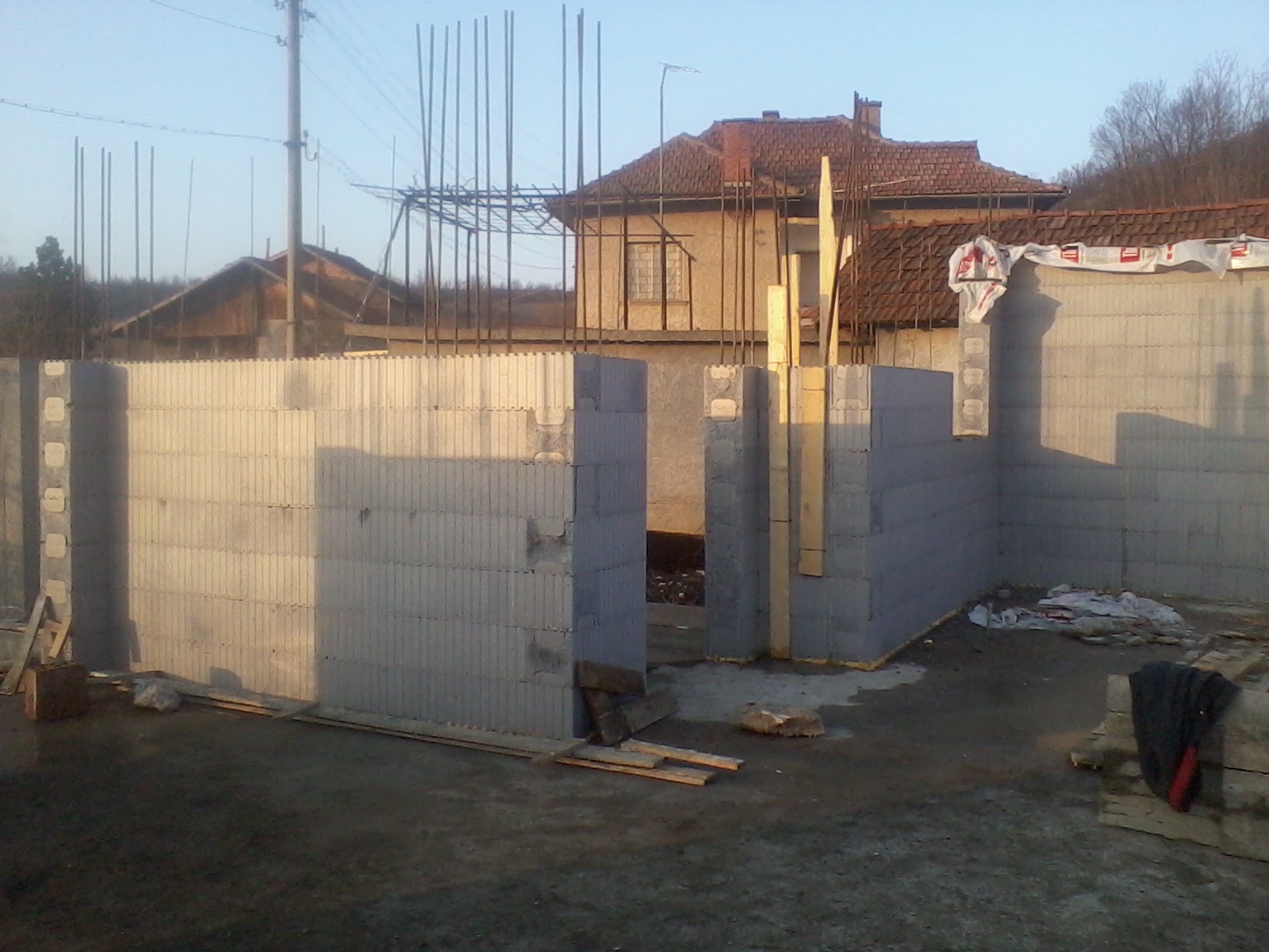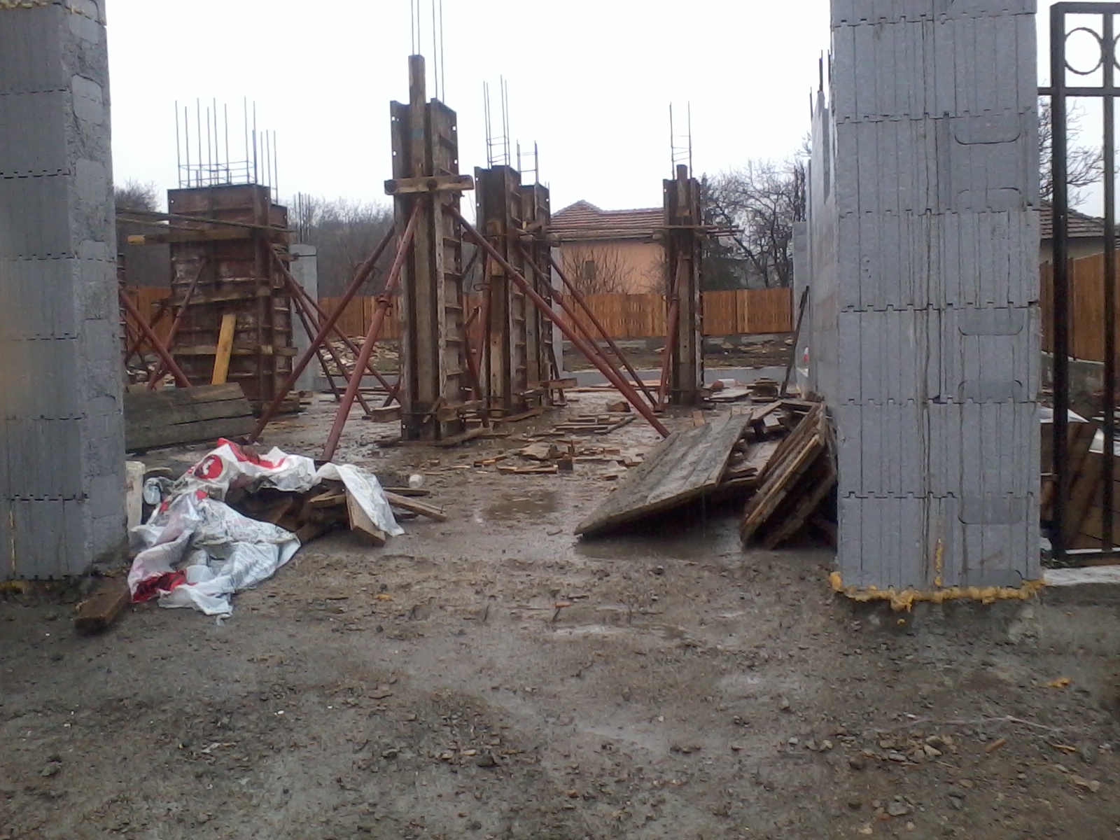Бързам да вдигна грубия строеж защото отливаме бетона на ръка.Докарват го готов ние само го разнасяме.И за целта ползвам услугите на моите работници и приятели.В нашия бранш(дограма и стъклопакети) работата тръгва от средата на Март.Гледам да използвам всеки топъл ден от зимата.Слагат добавка в бетона против измръзване(поне така казват!).Утре (събота) леем 4м3 и ще има още снимки.
