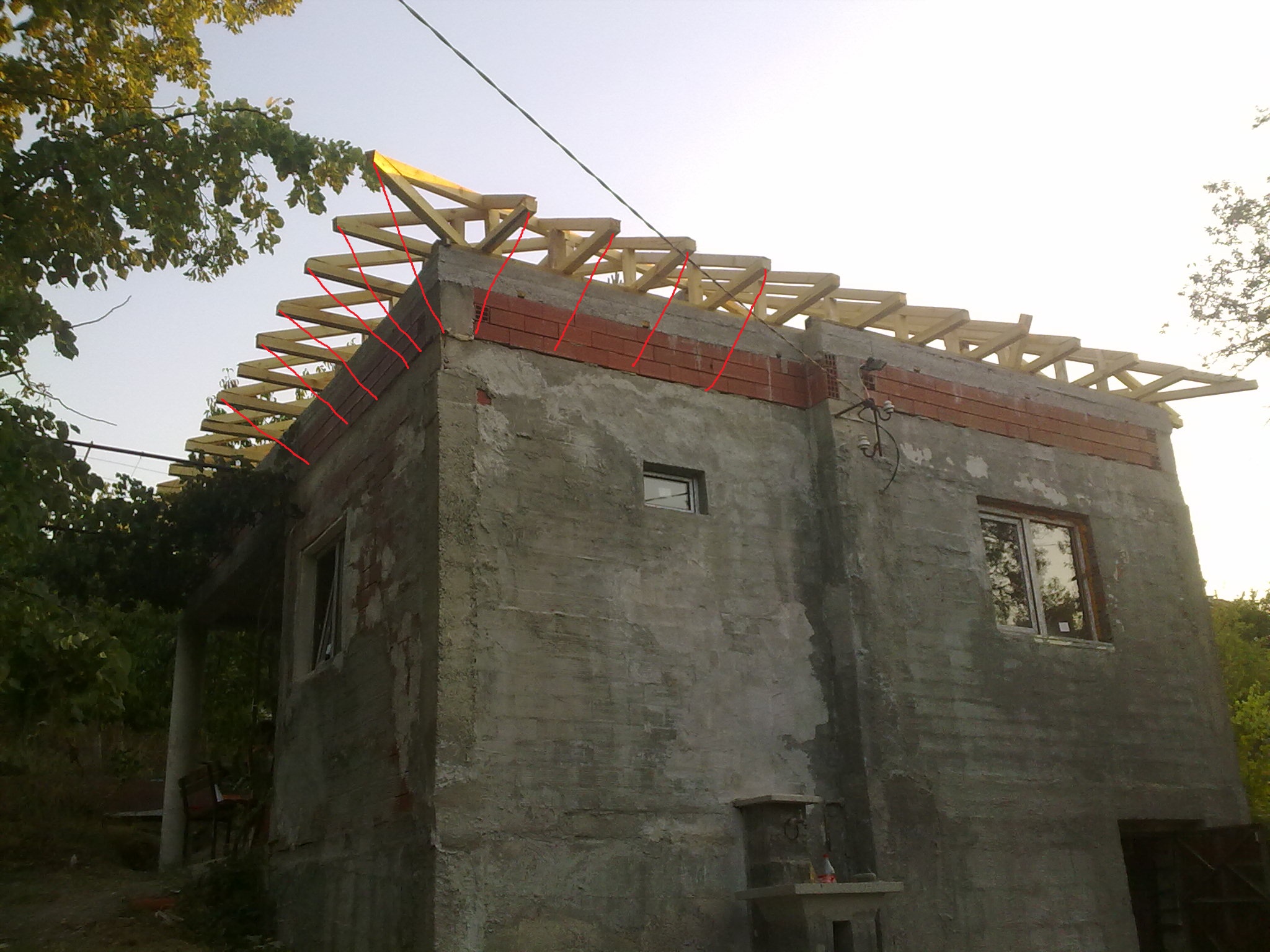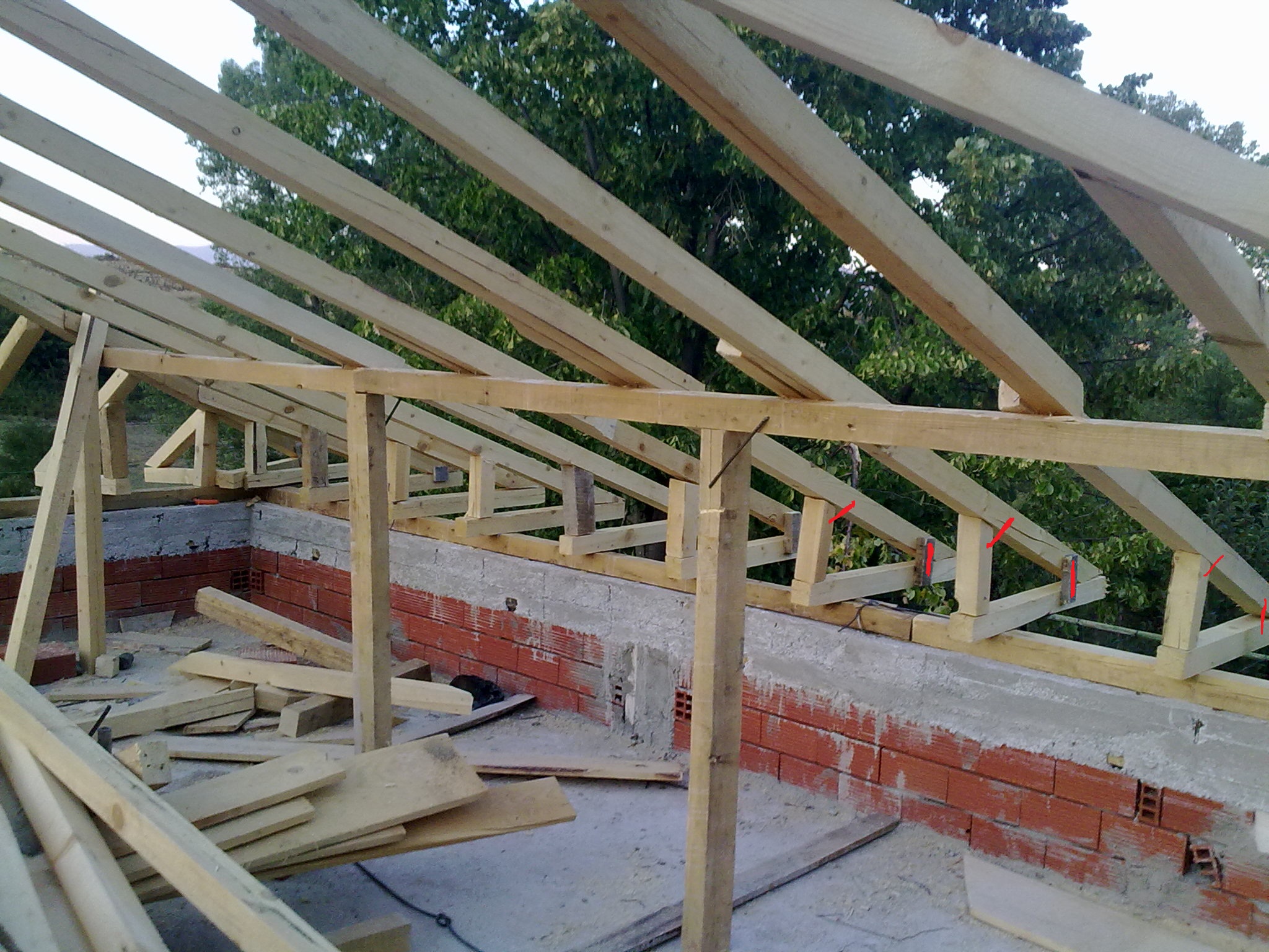IvanR написа:При снадката обаче положената ламперия ще ги укрепва и ще работят като едно цяло ребро,защото ги обхваща едновременно.Освен това,при наличие на ламперия,края на хоризонталната гредичка и през ум няма да и мине да помръдне.Между другото,ако все-пак е проблема там,не пречи през греда примерно да пусна по една гредичка под 45 градуса от края на водоравната къса гредичка до стената на къщата.Нещо като на снимката-sasho 28 написа:Да този ефект ще бъде най-изразен, когато снега се топи и образува "торби" до стрехата. И още нещо, при теб реброто не стига до билото, а е снадено, поради това при този вид товар, ще се получи "повдигане" при снадката.IvanR написа:Sasho28, направи един експеримент.Ако вържа върха на реброто и дърпам,в задния си край то пък ще надига реброто чрез късата гредичка,тъй като се получава ефекта на везната и ще се мъчи да се разкове при върха.Такава по вид сила не знам как ще се появи,освен ако челната дъска и улука не натежат чак толко,но няма да е зле да сложа по една метална скоба там.На мястото на ограденото трупче на снимката.Тук се явяваш прав.