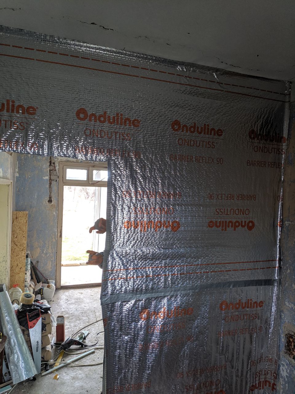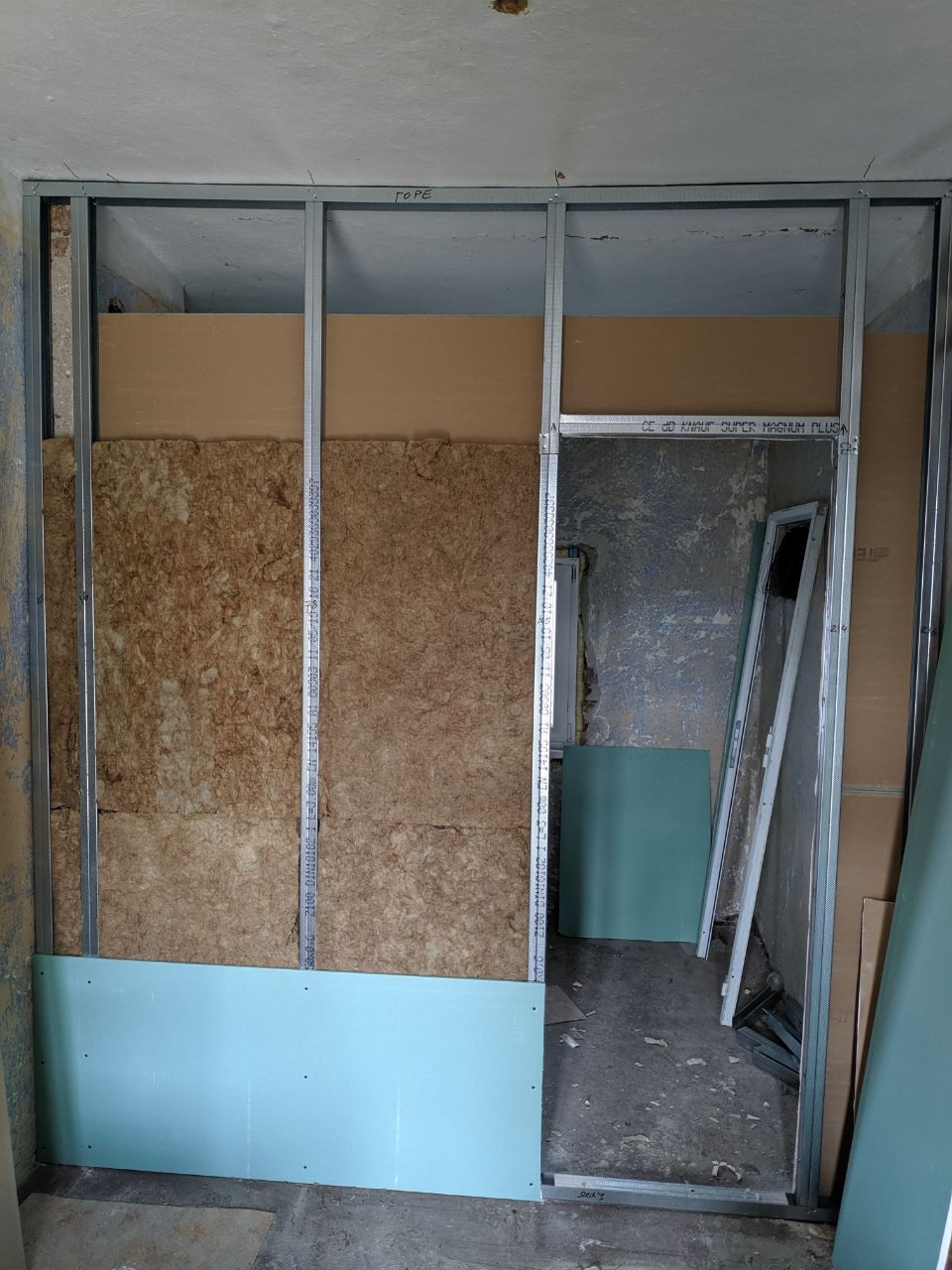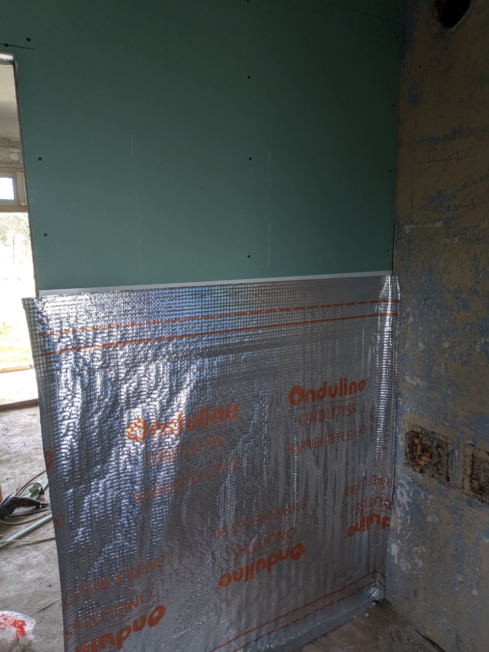 Отвътре между двата картона сложихме и паропреграда, може и да е излишна малко, но да има. Като дойде ред шпакловка по фугите, хидроизолация (за Мапеи само хубави работи съм чувал) и отгоре плочки. Вярвам няма да мине влага