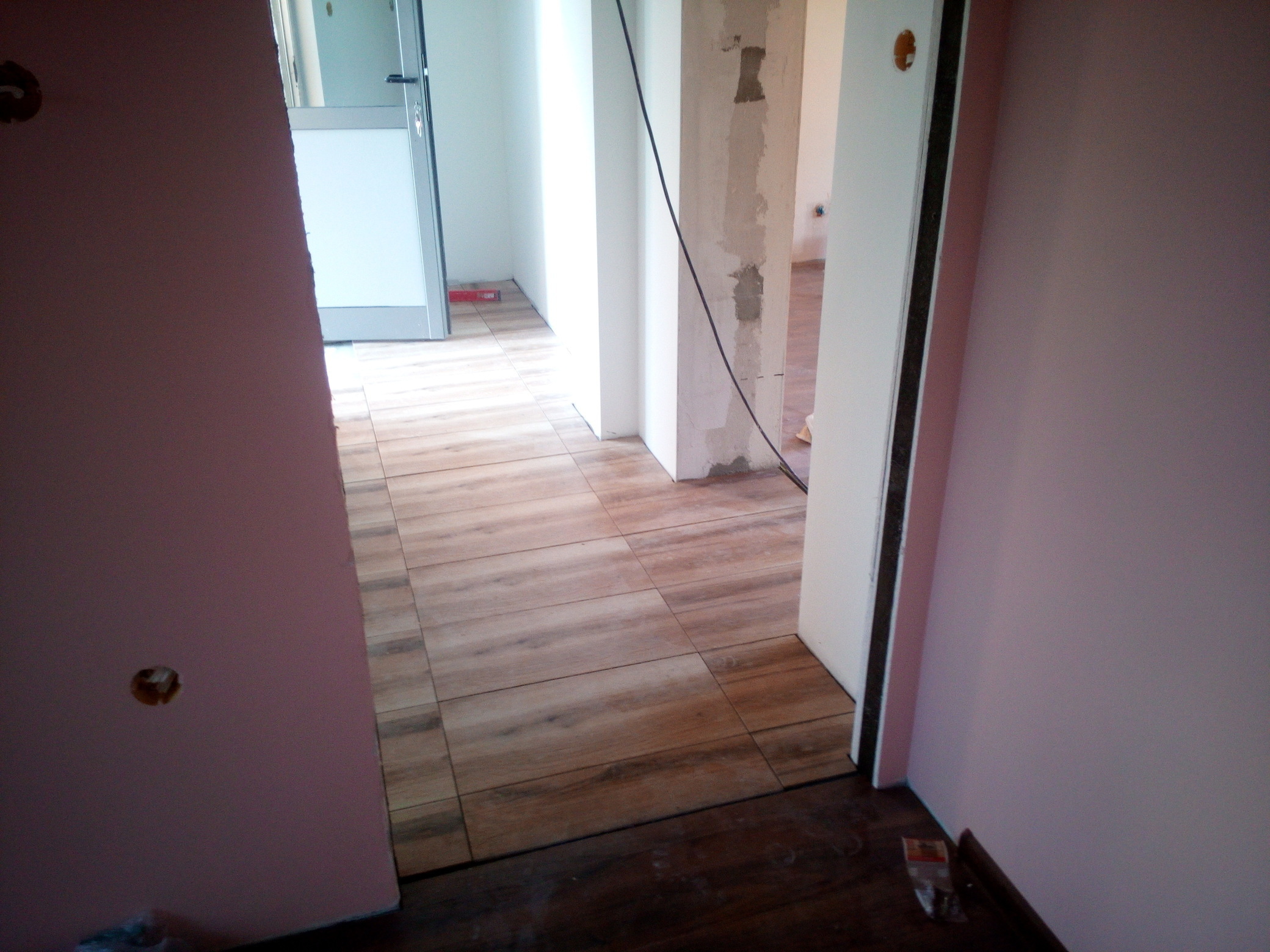 В коридора налепих гранитогрес и намазах останалата декоративна мазилка на пониженото ниво на тавана на малката, това понижение не е за красота просто там трябваше да сваля нивото заради греда която минава по-ниско и носи част от покрива.