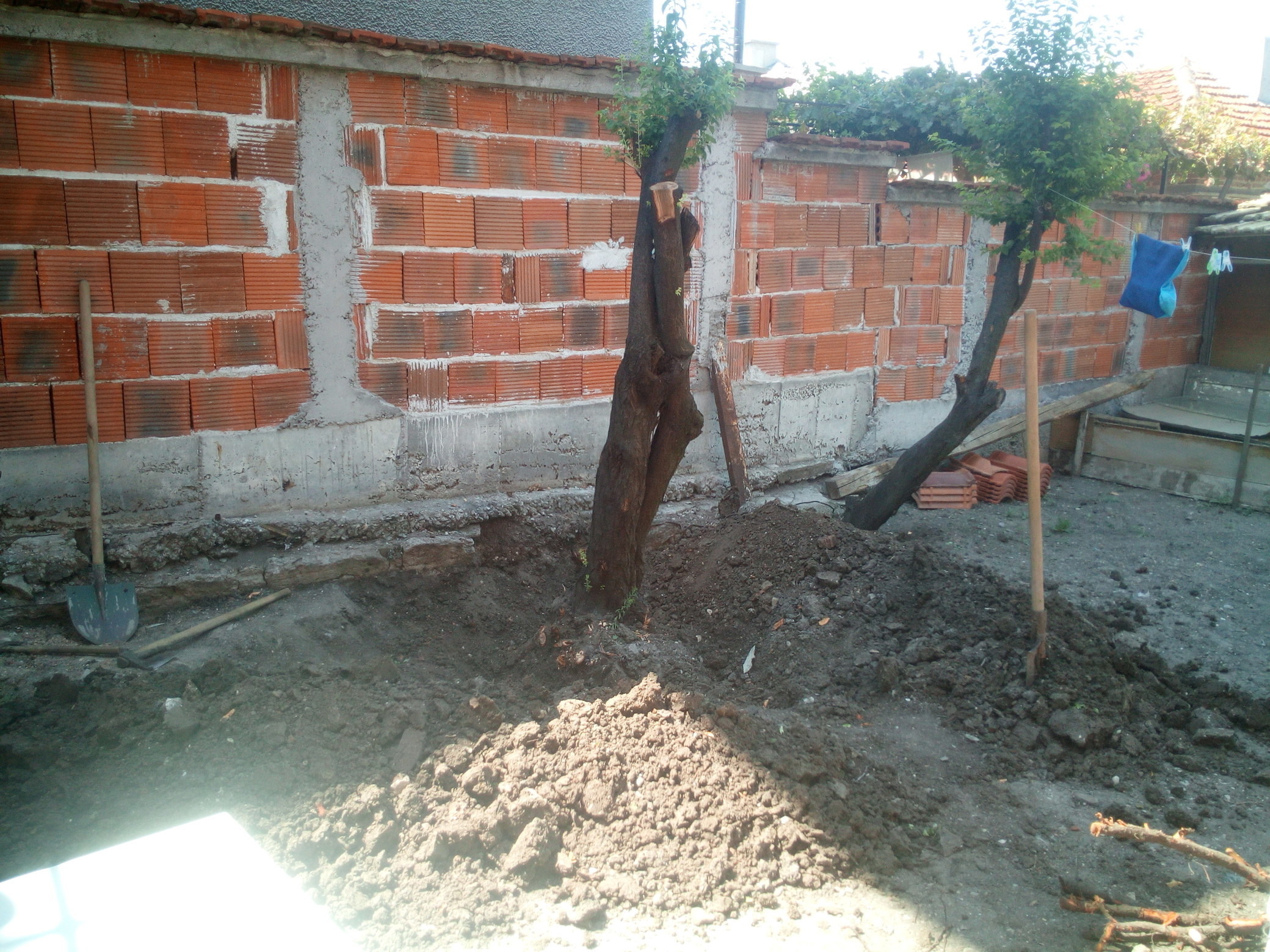 Входа за долния етаж беше под стълбището и по този начин беше и трябва да е със стъпала, а това не ми хареса да е така при дъждове и снегове евентуално. Реших да го иззидам и затворя там , а входа да преместя на другата стена на мястото на единия от двата прозореца и като се свали малко нивото на пода, а то позволява поради преработената канализация и до колкото позволяват основите да стане на 0. Така в бъдеще полувкопаният долен етаж да придобие що годе приемлива височина. Междувременно имаше 4 джанки, които бях решил да ги махам, но изчаках да узреят да сварим компот да не стават зян.
