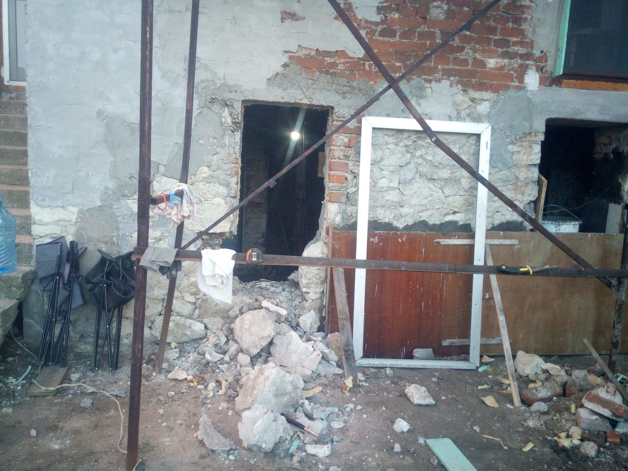Когато ми остава лепило като правя нещо го мажа на стените да се спояват тухлите, нищо че ще има изолация, грунд не слагам само с метлата и пръскам вода. Е на тоя джам му излезе късмета да става врата, сложих временно каквато имаше под ръка от предишния вход да изкара зимата и да не замръзнат тръбите ако дойде люта зима. При събарянето ме очуди това, че не е толкова паянтово колкото изглежда, щото е зидано с глина и все пак внимавах да не направя някоя поразия.