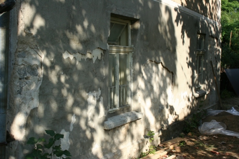Другият въпрос на този етап е какво да правя със стените от вън? Казах, че са мазани с хоросан, явно не е слагано цимент и с времето всичко това започва да подава и се руши. Една от снимките показва какво е положението с едната стена, а другите не са много по-различни.