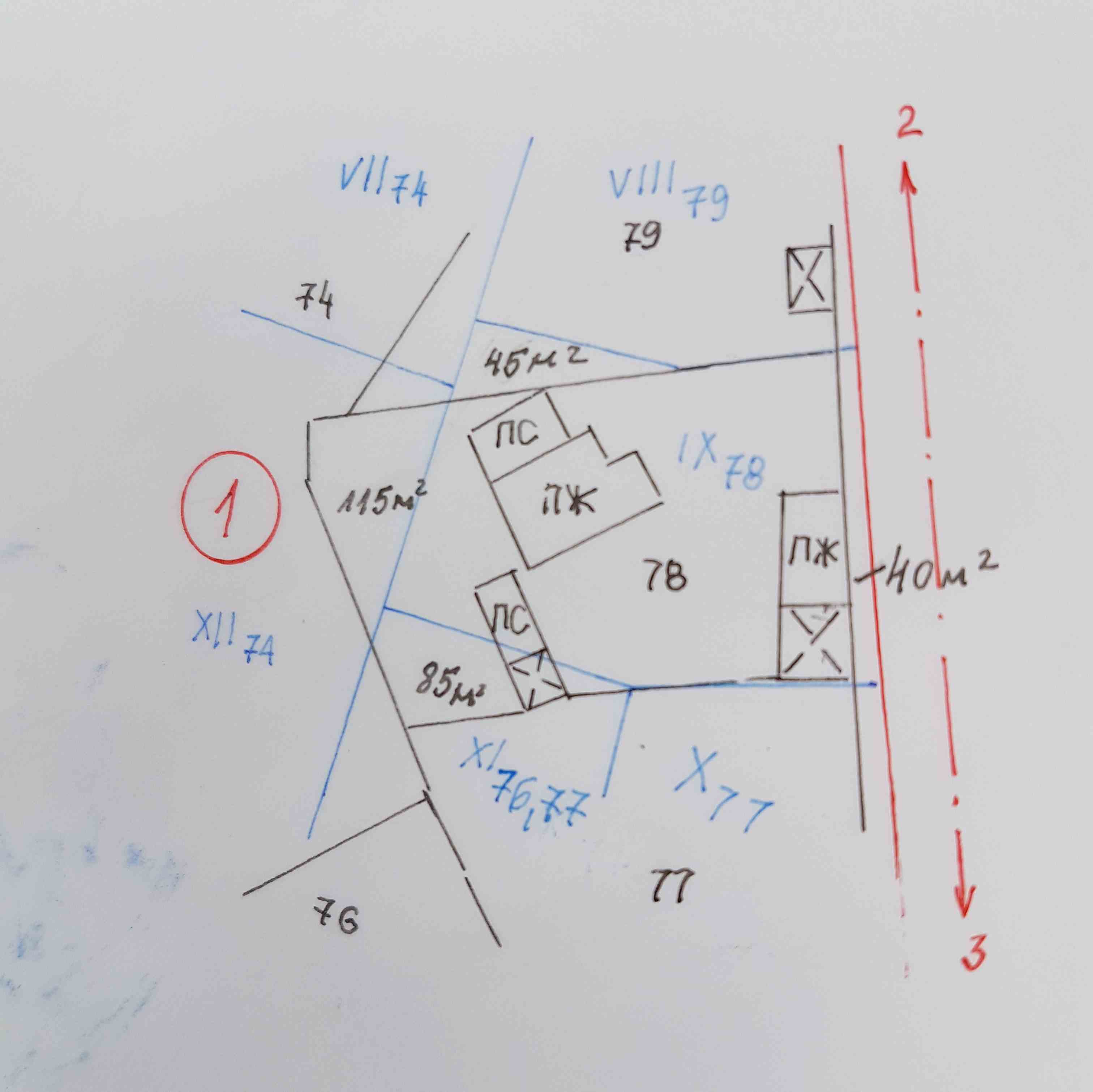 Прилагам и скица на имота. Балкона на къщата мисля да сочи към улицата. Къщата мисля да е където е била старата къща по средата.