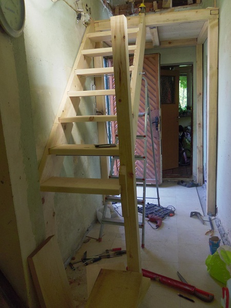Самото място бе доста ограничено, денивелация от три мера а единственото място на което може да се поставят стълби е коридора, който трябваше да остане използваем, с размери 4м на 1,5м от които за стълби можеха да се ползват не повече от 2,30м и широко 60-70см. Над входната врата направих стълбищна площадка 1,3х1,5м. Слава богу, не се удря човек в покрива.