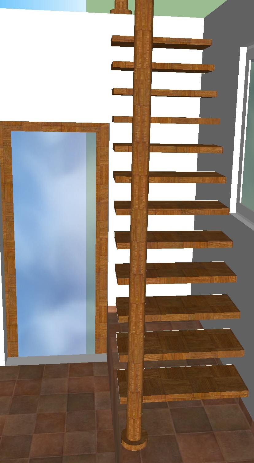 yancho_lud, нещо не мога да видя вити стълби на такова място. Ще предложа нещо, ако не ти допадне здраве да е. Направи ги пачи крак, а модел и цвят по твой вкус. Разгледай тук за идеи. Нахвърлих ти на бързо един "чертеж". Обърни внимание и размера на отвора ... да не си блъскате главите като се качвате. Цилков ти е казал за слабото място. Ще се наложи да махнете ~1m² от плочата. Този "пилон" на картинките освен за захващане на парапет трябва и да носи. Сложете метална тръба с по дебели стени преди да започнете да отваряте ... после може да се облече с каквото решиш. Нямах време да "изрежа" стъпалата като за пачи крак ... линка горе. Използвах размерите които си дал, така че би трябвало да е в мащаб: