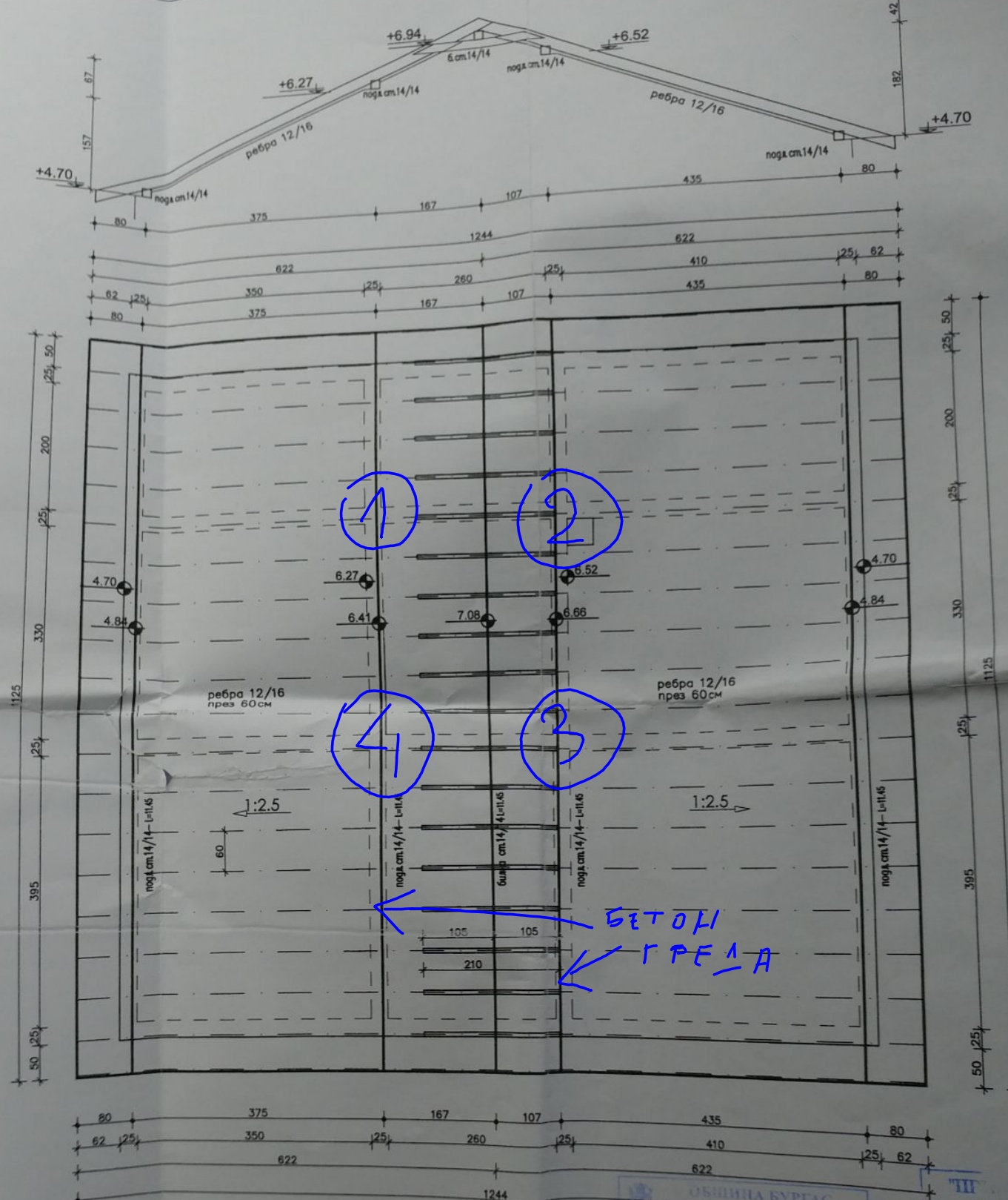 Приложил съм снимка на покривната конструкция по проект - колони 1, 2,3 и 4 идват от първия етаж и са стоманобетонни. Посочил съм и двете стоманобетонни столици по проект.