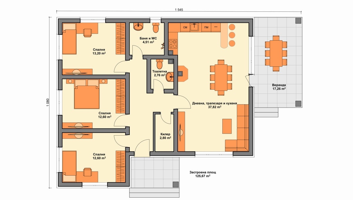 Преминах цялата бюрокрация и вече имам Виза за проектиране. Харесал съм си разположение на къщата, която ще е на един етаж и прилагам примерно разположение на нещата. Отоплението ще е подово с термопомпа, или въздухарка или вода-вода в зависимост от подпочвените води. Имам и кладенец пълен до кота 0 което показва доста високи подпочвени води. Моля за препоръки и предложения за разположението. Дали „килера“ ще е достатъчен за термопомпата или трябва да го разширя с 80см. Примерно към хола. Приемам всякакви предложения и критики.