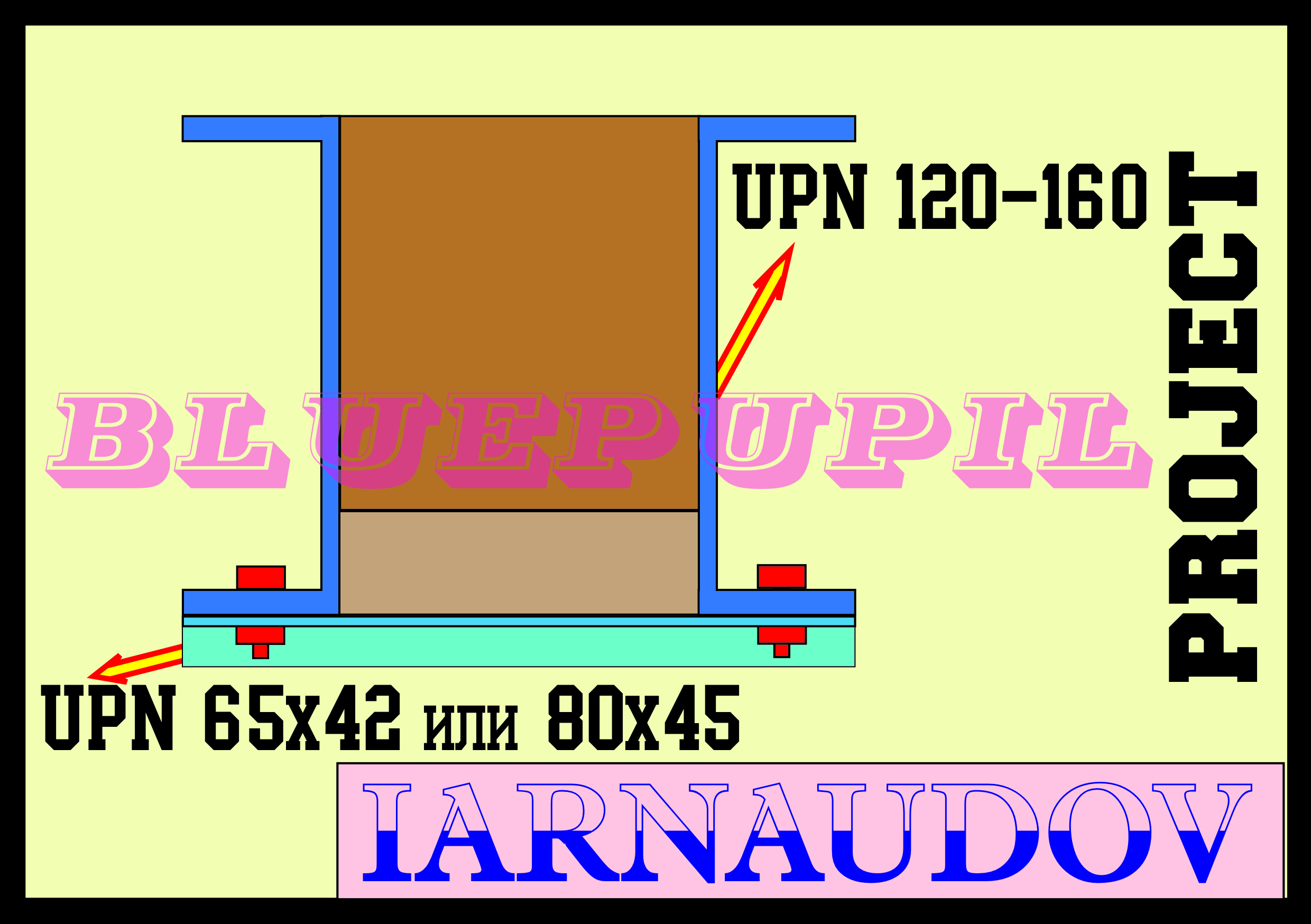 :idea: Няма нужда от пробиване и шпилки. 2бр. UPN 120-160, от двете страни на дървената греда, като сандвич. Долните фланшове на UPN са свързани с мост ( UPN 65х42 или 80х45), през 50см с болтове.