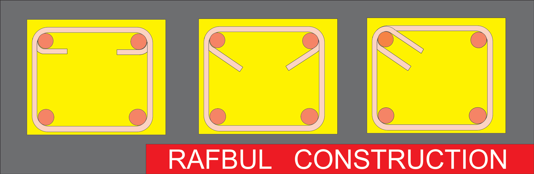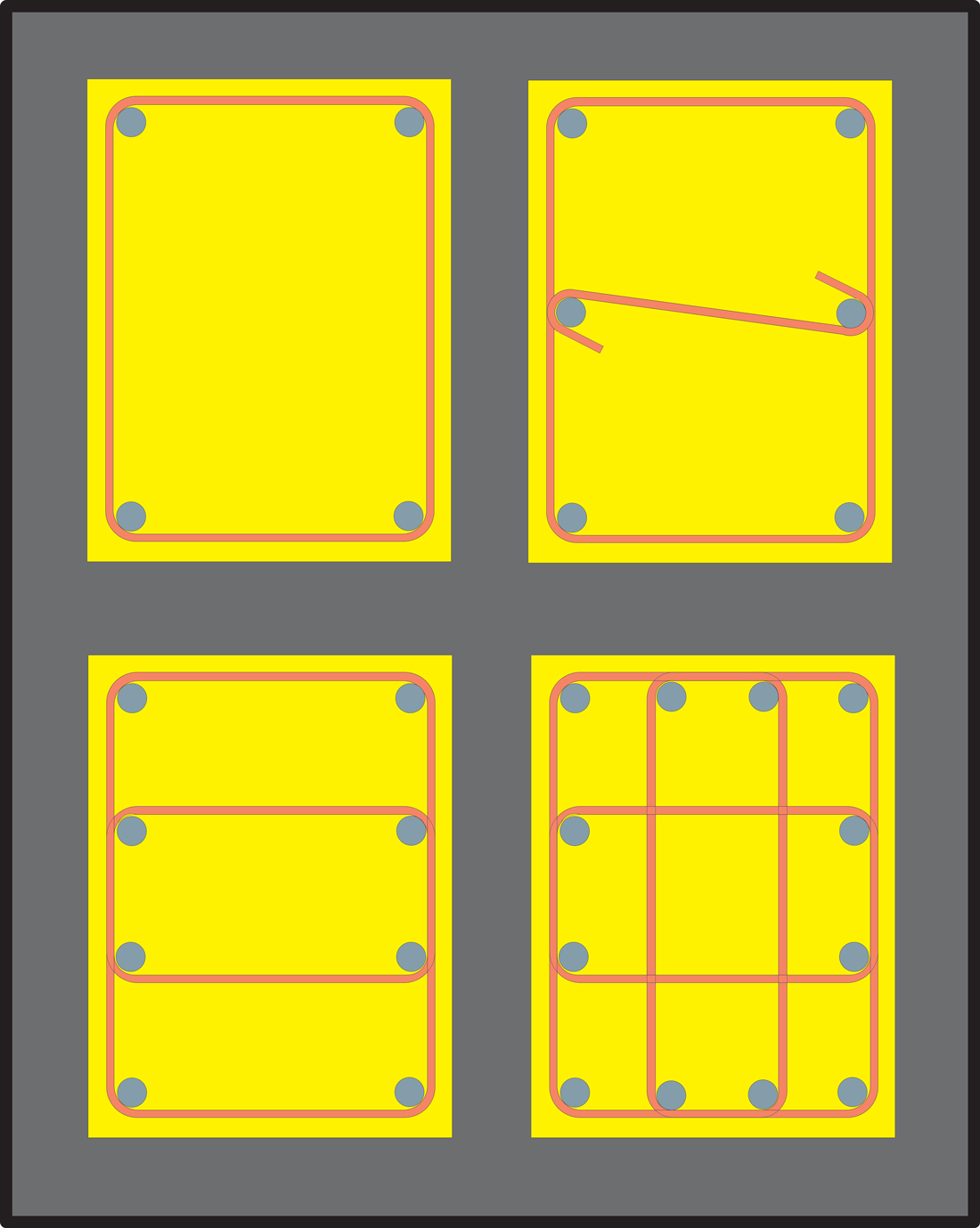 Първата бигла е на 5см. от плочата, в следващите 40-50см. биглите са през 10см. вървейки нагоре по височината на колоната биглите се разреждат на през 15см., след това на 20см. Като в средата са най-редки, но не бива да са на повече от 20-25см. От средата нагоре биглите започват да се сгъстяват със стъпка аналогична на тази при долните. Върха на колоната, там където стъпват гредите или безгредовата плоча заслужава, прецизно полагане на арм. и бетониране, тъй-като обикновено там възникват проблеми при по-силни хоризонтални натоварвания. Добре е да не се допуска, вертикален прът от колоната , който да не е обхванат от бигли или есове. Показани са няколко начина на армиране на колона, като са дадени и по-големи и тежко армирани колони, тъй като автора не долюбва шайбите и е на мнение ,че (доколкото е възможно и в съвместна работа с останалите колони, греди и плочи) всяка една колона трябва да се стреми да поеме колкото е възможно повече от хоризонталната (сеизмична) компонента на вертикалния товар , който носи.