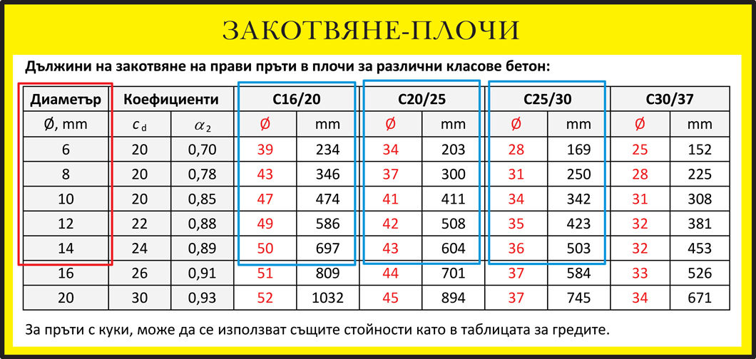 6..Плочи- При безгредовите плочи, трябва да се обърне особено внимание на армирането и бетонирането на частта от плочата над колоните. За да не стане фермана твърде обемист няма да включа въпросите с армирането на полетата (по-нататък в темата може да ги обсъдим). Само ще кажа, че диаметъра на арм. дрябва да е такъв , че при ходене върху нея да не става на спагети. Мин. дължини на закотвяне при плочи са дадени по-долу.