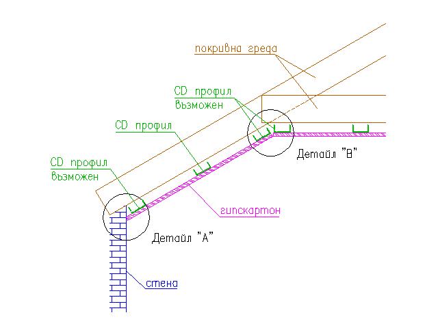 Трябва да направя таван с гипскартон в подпокривното пространство на една къща. Таванът ще има геометрия, както е показано на картинката. Досега никога не съм се занимавал с такова нещо и всичко е ново за мен. Та реших да ви питам. Въпросът е как да се закрепи гипскартонът в краищата, които съм означил като детайли А и В. Мисля си че е възможно да стане с CD профили както съм ги нарисувал. Но може би има и по добри начини, за които аз не се сещам. Освен това не знам как да направя връзката между двете платна в Дет. В. Може би с някаква ивица (профил). Искам да се получи ясно изразен ъгъл, видим отдолу, в хубава права линия.