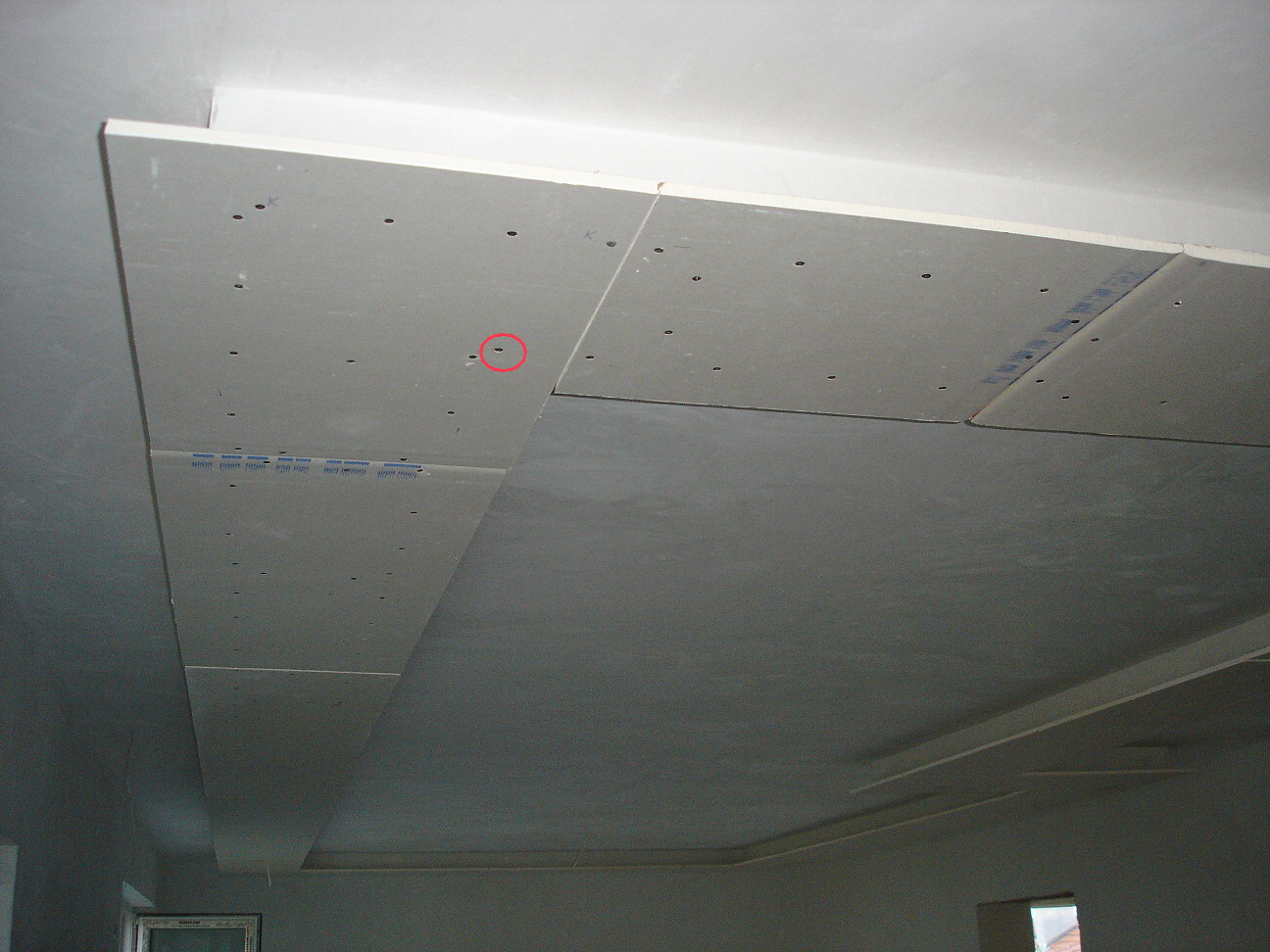 При вратите и прозорците за които спомена в поста си , чак такива напрежения не могат да се поличат, защото няма чак такива топлинни разлики, нито толкова големи температурни разширения. Принципите са си принципи и трябва да се спазват без значение за каква фигура /материал става въпрос! Дори всички допуснати грешки в този таван да бяха избегнати, то само топлинните разширения на метала в ръбохранителя е достатъчен източник на напрежения , за да се получи пукнатина във вътрешния ъгъл, ако не се ползва хартиена лента за фугата!