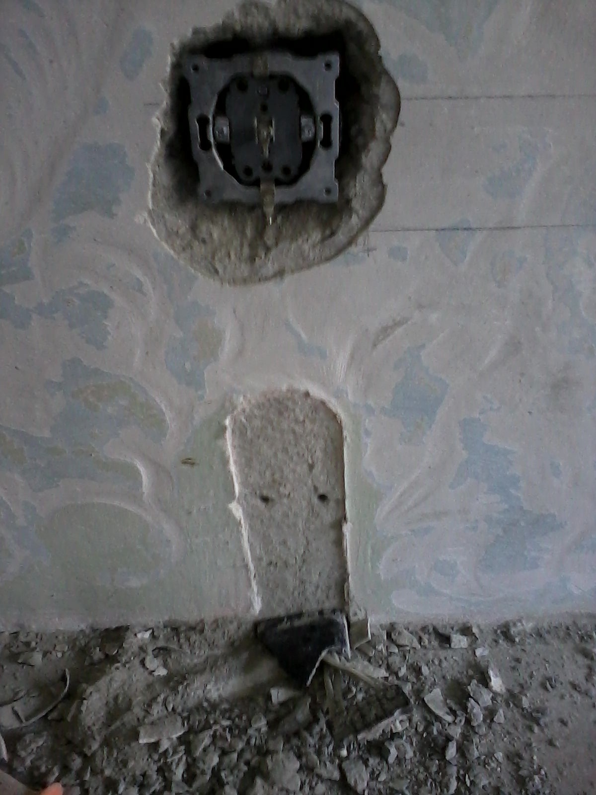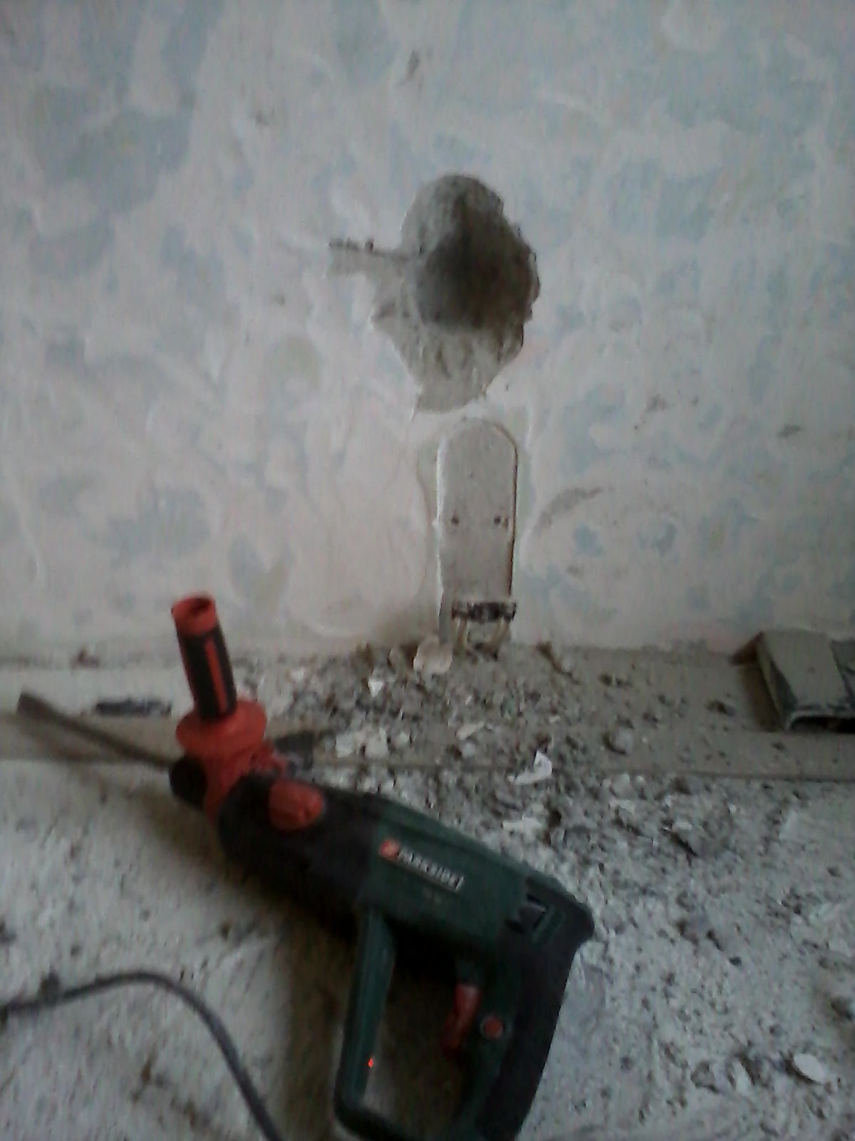 Вече съм свалил старата варова замазка и сега правя три дупки за контакта.
