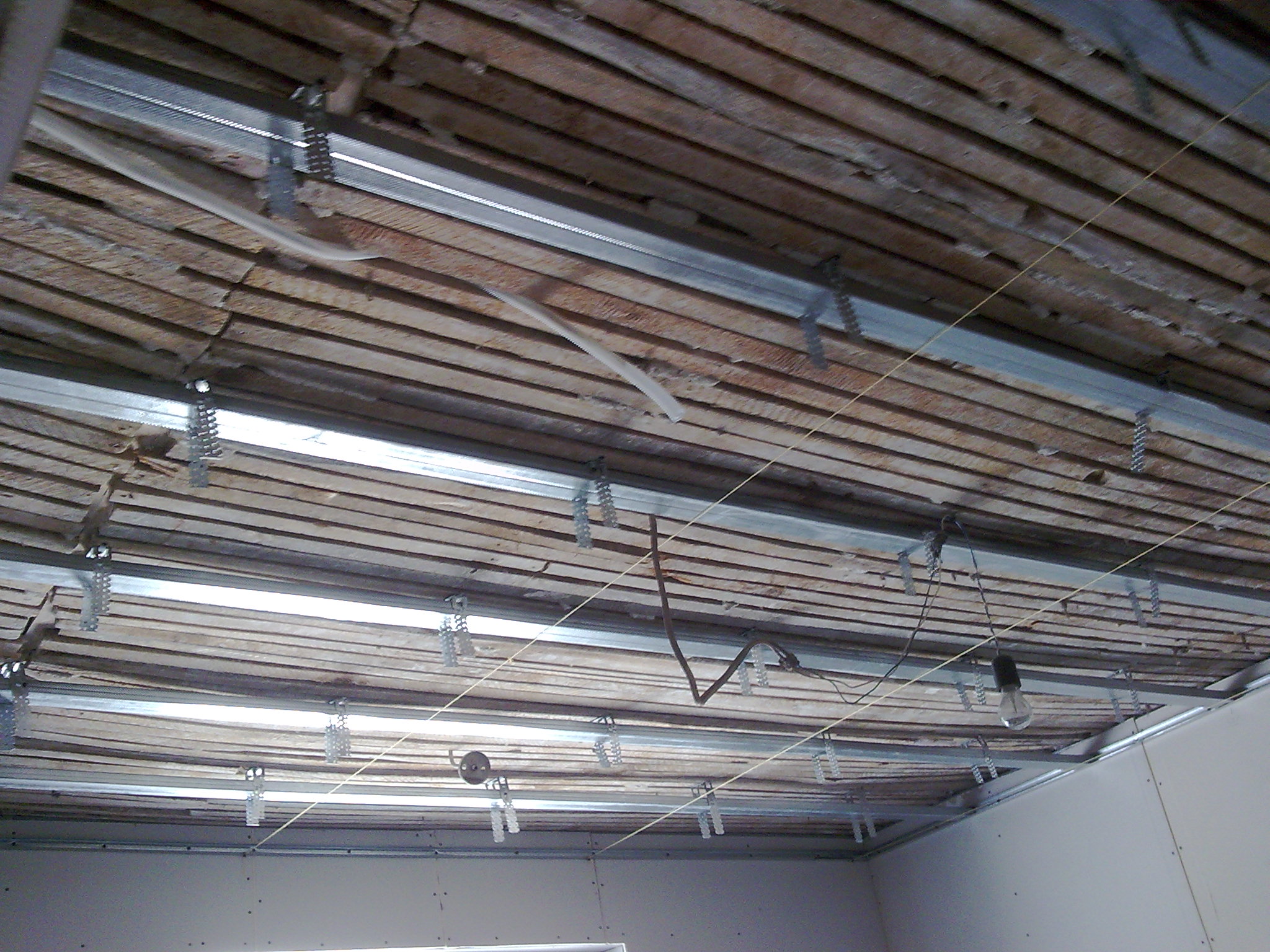 В момента съм до това положение, което се вижда на снимките. Нивелиран е идеално. Профилите са през 50см, захванати здраво за гредите(напречнно на тях са), директните окачвачи са през 60см. За 12кв.м съм сложил 35 окачвача, знам че са много но исках да стане здраво.