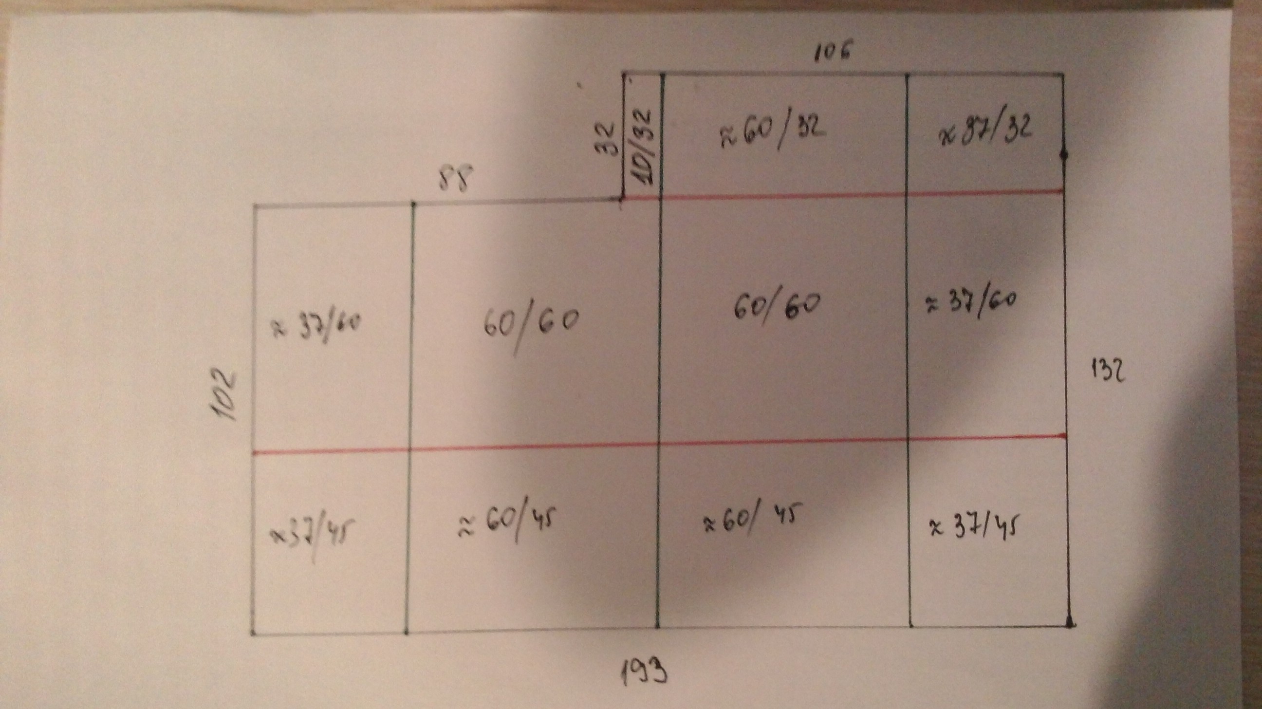 Привет,това е примерен таван в мокро помещение.Размерите са в сантиметри,а червените линии са носещите т-профили.Правилно ли съм ги разположил или има нещо което недоглеждам?На практика ще има 2 носещи и всичко останало ще е 60см и по-малки където ще се режат.Доста чертах,но както и да ги въртя това е единствения вариант с минимум парчета под 1/2 от цялото.Вътре в правоъгълниците съм написал приблизителните размери на парчетата които ще се получат.Приемам всякакви забележки.