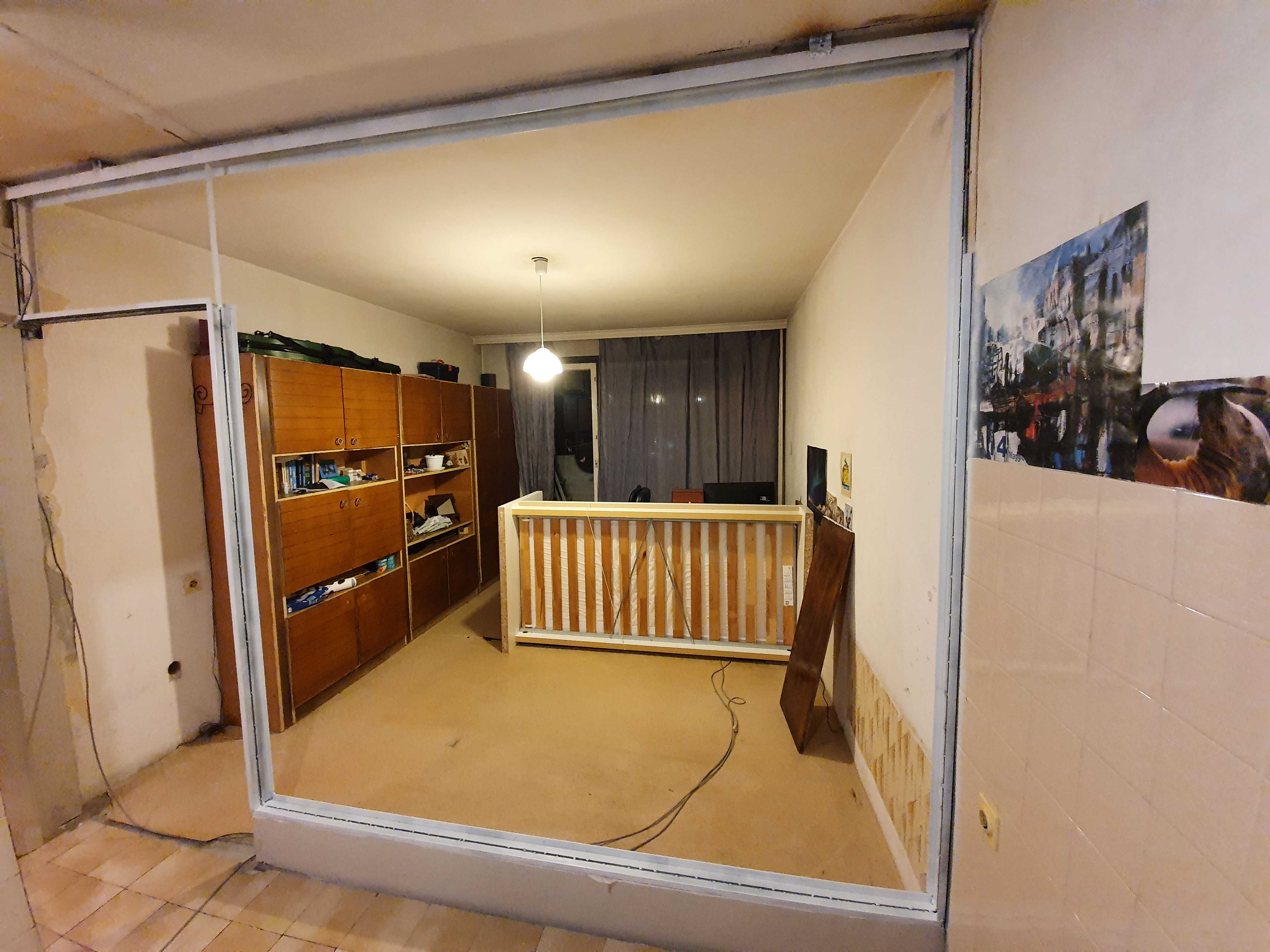 Другото най-хубаво е ,че конкратно на вратата на тази стена се оказа най-висок пода в целия апартамент ,та там ще ми е отправната точка. Оставям 3см просвет под вратата за замазка + 3 слоен ламинат (който съм харесал (14мм) и подложка). Всъщност в другия край на стаята е около 2см по-нисък пода ,което мисля че е ОК.