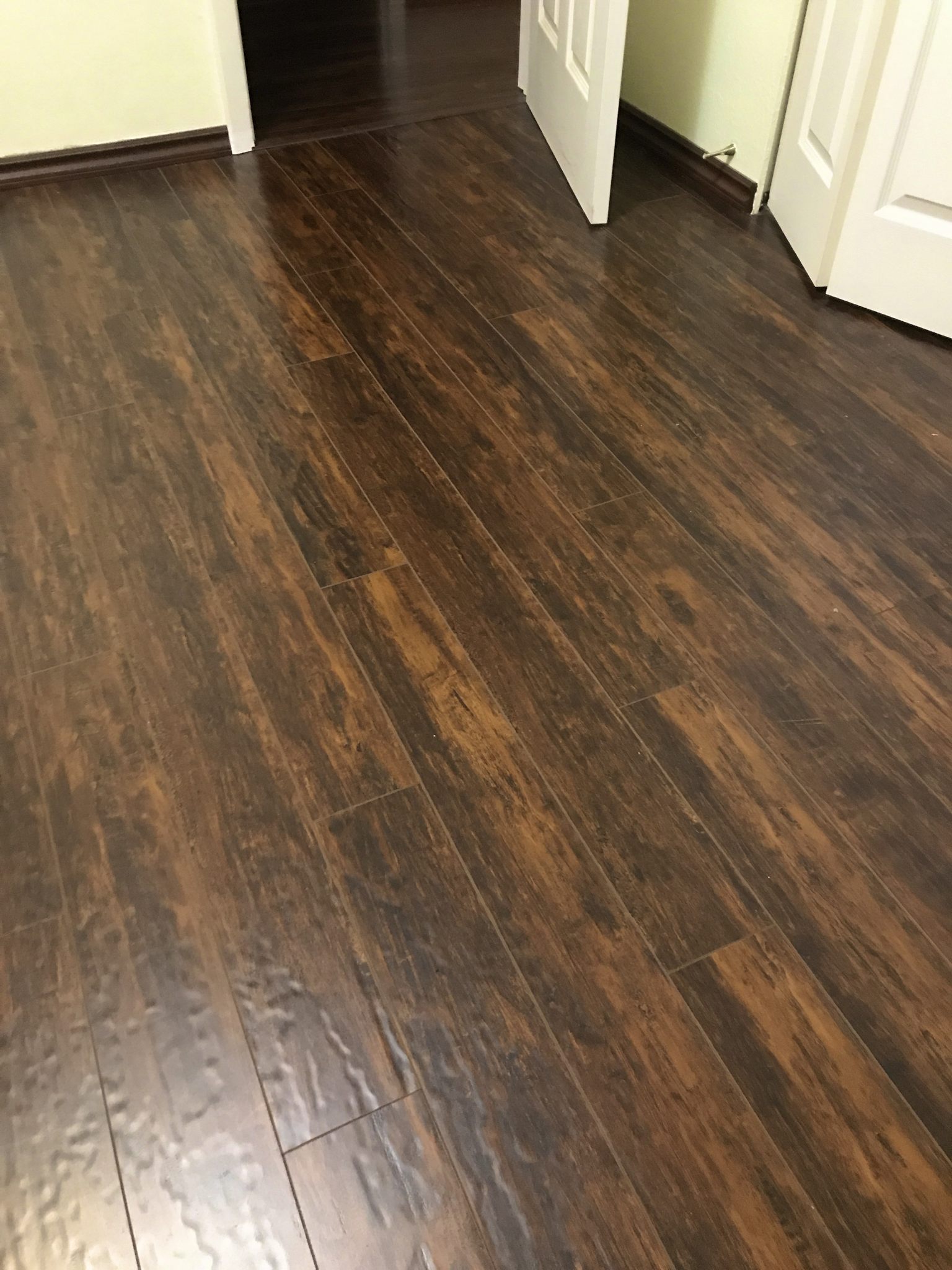 Въпросната 3-та стая за която бях дал схема и после някой беше питал да съм покажел реална снимка --- ето снимка по-долу. Ламината е 12мм дебелина, релефен и с фаски. Прозореца е зад гърба ми.