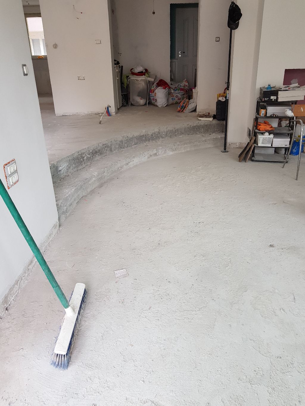 Помещението е 75 кв.м. , на две нива с извито стъпало. Отдолу е избено помещение, плочата продължава навън като веранда без термомост.