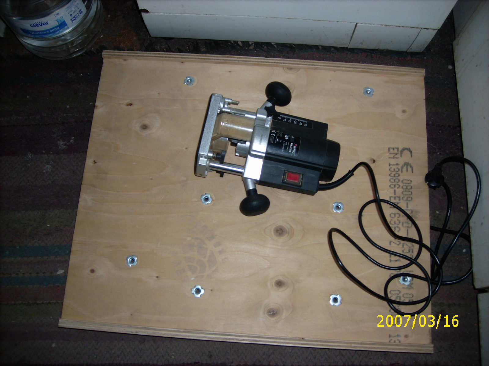 , разбира се. Изходната позиция е следната: машинката ти е позната, а материала за масичка е 15 мм шперплат...отпадъчен продукт от контейнер за техника. Сега на вилата е Сибирска зима и ходя само за да си храня ротвайлера, по-натам ще кача снимки на развитието на масичката...П.П.датата на фотоапарата не е вярна, днешна е, не съм я коригирал