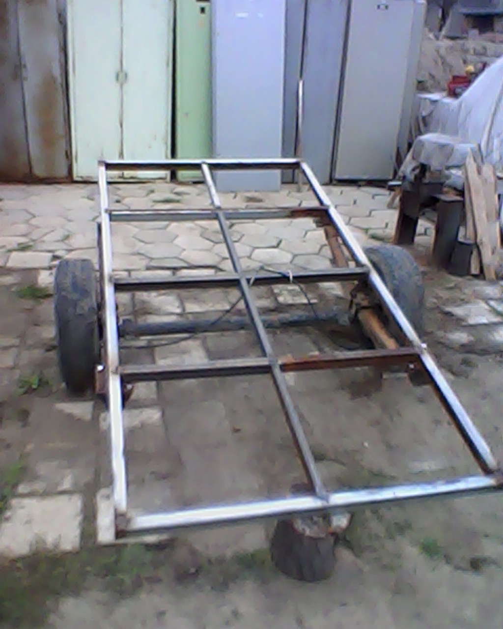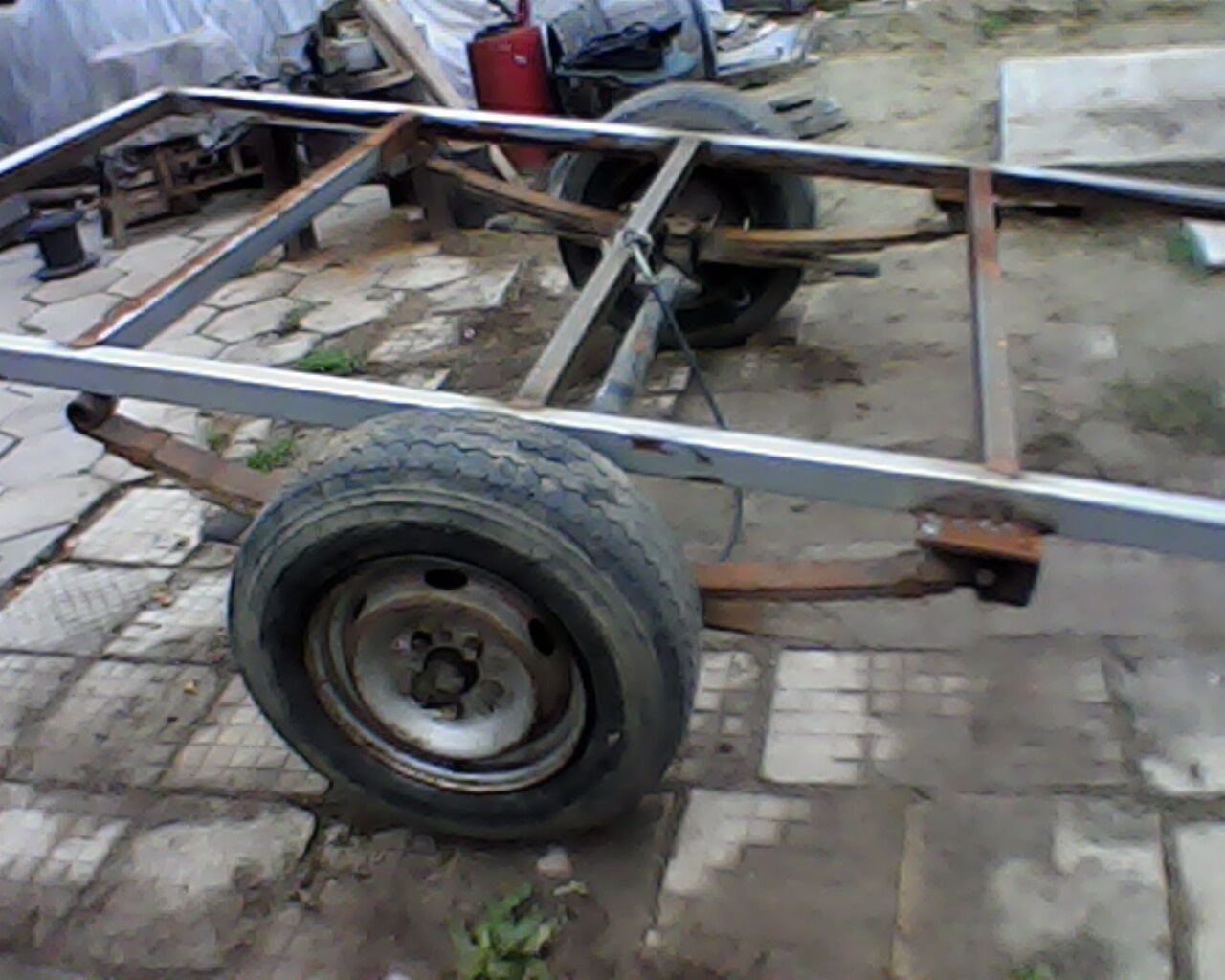 Междувременно вече подкарах работа, паралелно на няколко други бойни задачи. Сега върви от неделя на неделя, когато има време. Рамката и трите напречни греди са от тръба 60х40х4мм. Надлъжната по-средата е от 50х30х2мм. Вече става доста тежка и все по трудно я обръщам и въртя, за да заваря всички шевове както трябва отвсякъде. Моста е от фиат дукато 83-г. в комплект с ресори, амортисьори, джанти и гуми. На ресорите са добавени 3 листа допълнително. Целта ми е 1000 до 1500кг. полезен товар. Гумите са 185R14C, лекотоварни по 800кг на всяка. Освен това ремаркето ще бъде самосвално, и ще има инерционни спирачки. Имам теглич от някаква платформа 750-1350 кг. Жилата ще се вържат с жилото от ръчната сприрачка на дукатото. Мисля да намеря крик от баба жужка за маневреното колело. Коша ще се закопчава за двураменния теглич със закопчалки за канати. Тегличът ще бъде от Побразен винкел 100х45х5мм., и ще се захваща за коша с масивни панти, малко преди средната греда. Има още много работа, и ще се радвам на обмяна на опит с колеги, които са се занимавали с такива самоделки...