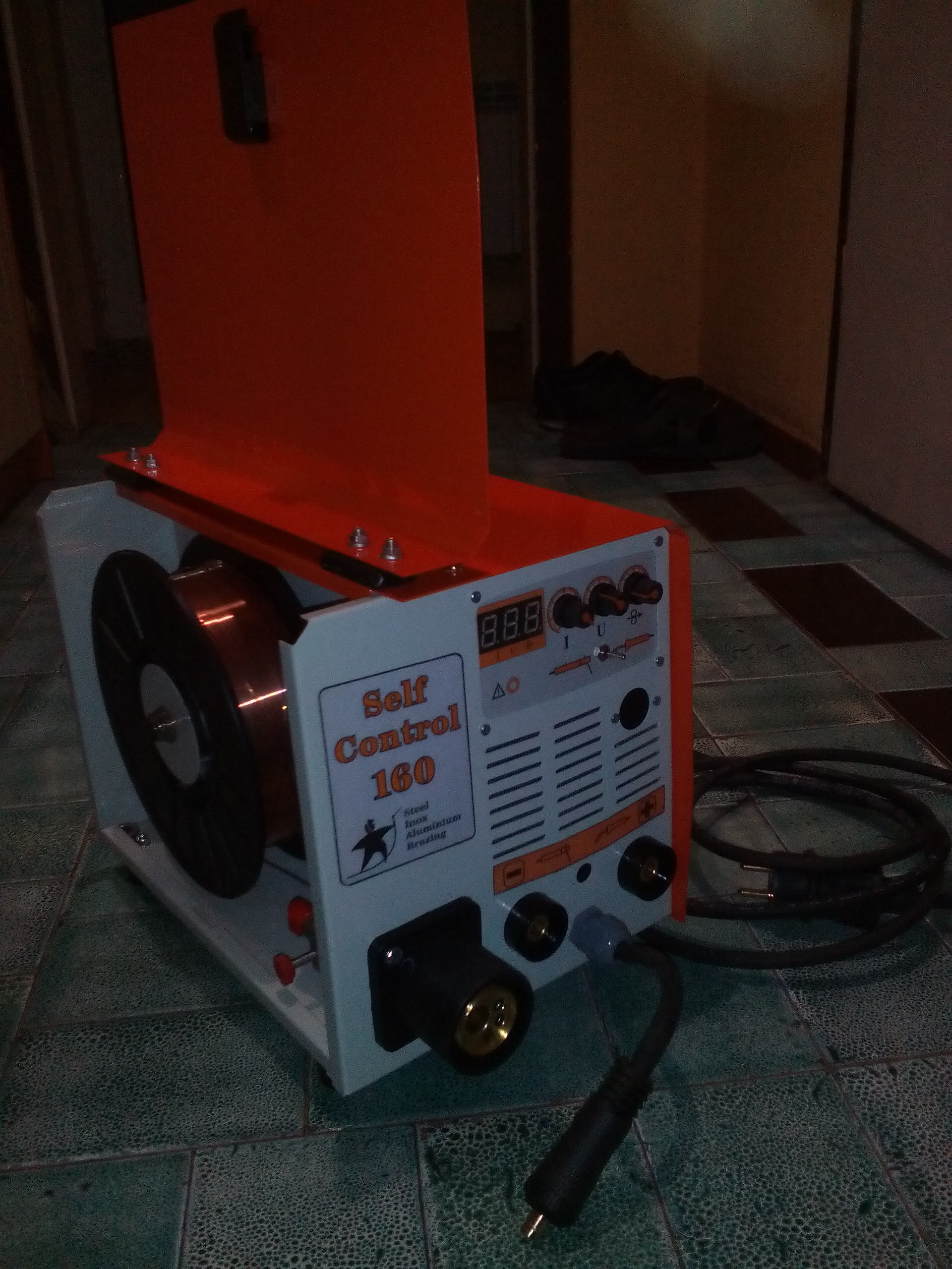Е това е цялата машина,заредена с тел и с кабелите за електрожен и с шланга за СО в кашона и с всичко необходимо за работа и се носи наведнъж.Торбата с маската и престилката на рамо,машината в едната ръка(като я хвана за дръжката кашона си тръгва с нея,тежи 12кг с ролка 5кг тел зареден в нея),бутилката в другата , и си ти ако ще да е и на не знам си кой етаж работата,примерно.Дори в багажника и на обикновена лека кола не заемат място и си товариш и другите машини или материали и така :yawinkle: