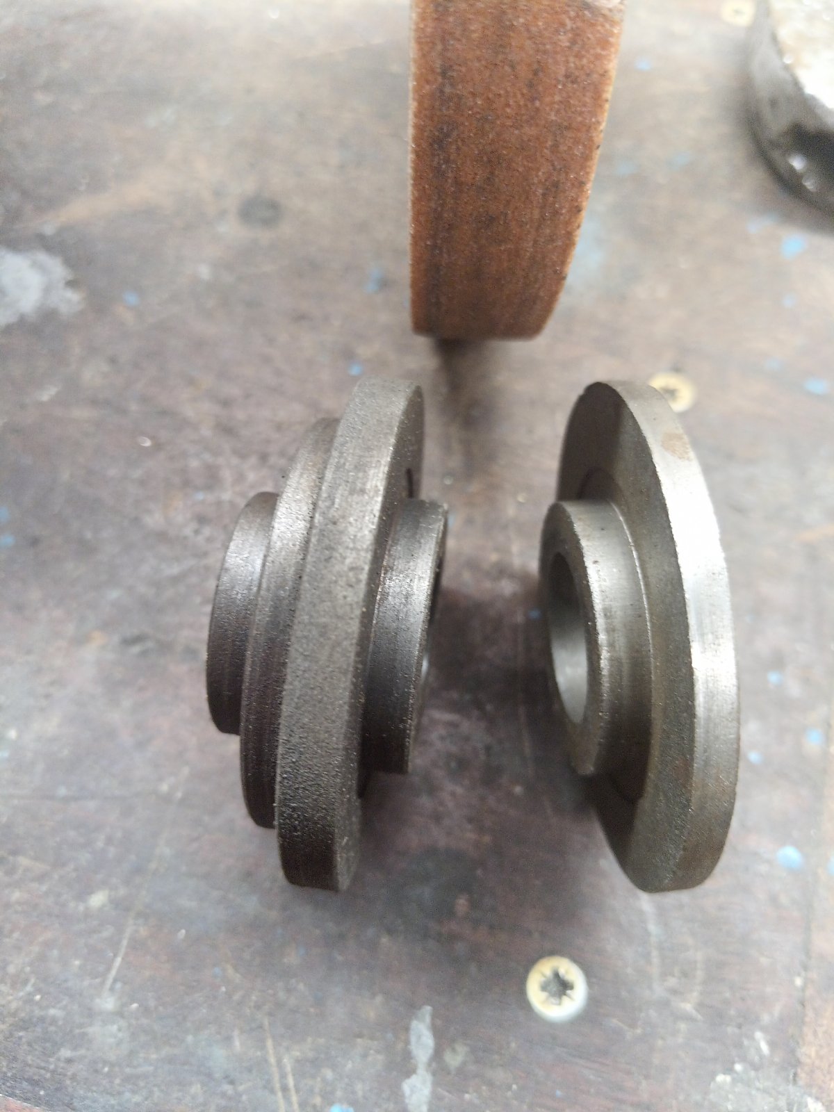 P.S. Взе да ми идва, че май правих някакви фланци, ама... Така или иначе камъните ще бият. Сдобий се с онова диамантеното за заточване, и като монтираш диска, с него ще обереш диска отпред и странично, колкото можеш. Подобрява нещата драстично. Доста често камъните играят и по плътност, освен на размери, ама там нищо друго не можеш да направиш, освен да си играеш да го въртиш спрямо оста и да търсиш най-малко биене. Преди 30 години бях шлайфист в ЗММ, та там като сменяхме камък си играехме няколко часа да го балансираме - хем на фланеца си имаше система с балансиращи тежести. Е - мащабите са други, но принципа е сходен.