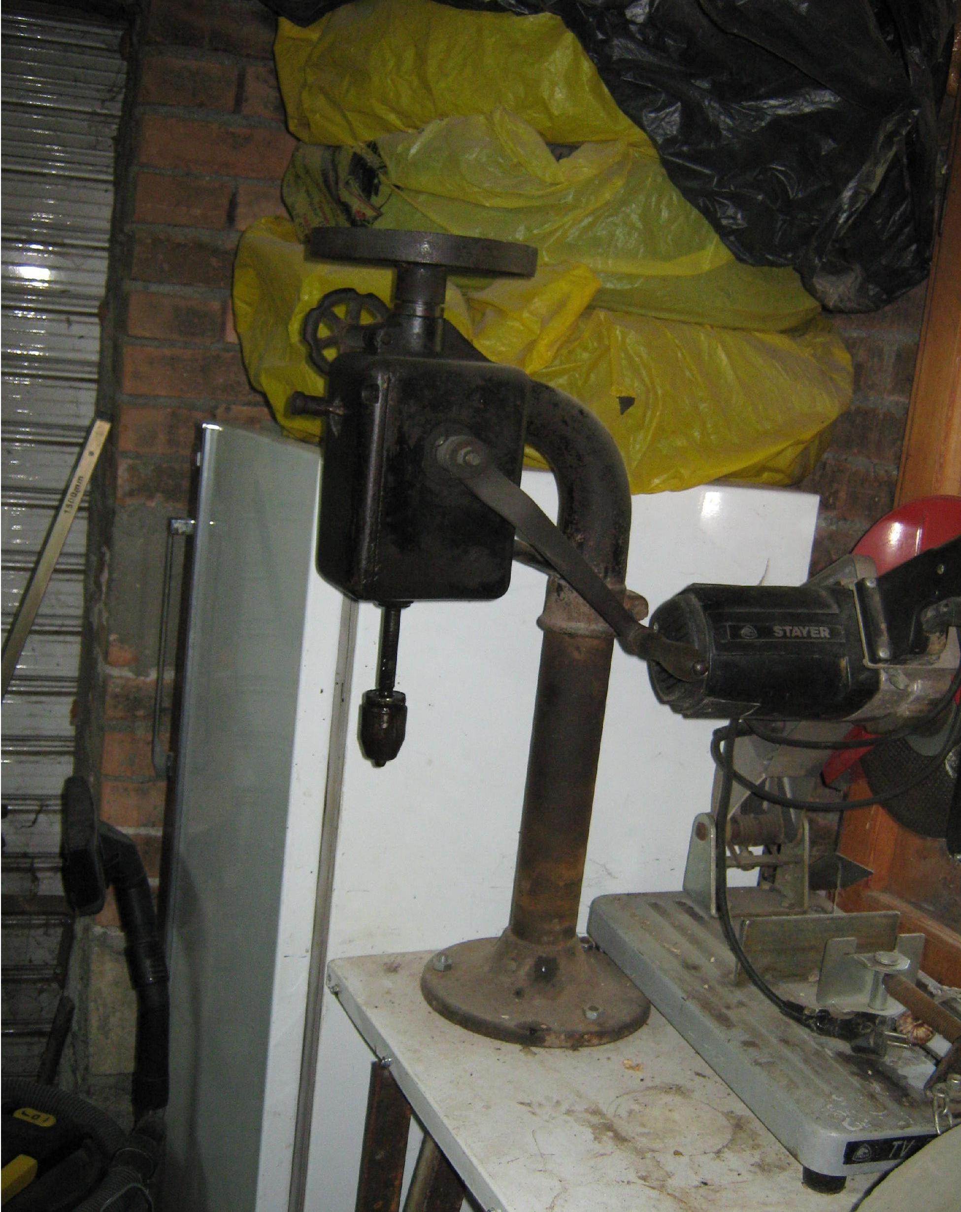 Обещавам снимки! Производство от преди девети, даже има две скорости, отгоре с маховик. Патронника е на резба, сваля се без проблем, но няма какъв друг да завия. Липсват му отвътре някакви пружинки между челюстите и още нещо( стегнат докрай не избутва челюстите). Масичката е подвижна по колоната, но е счупена в основата и днес говорих на Земляне цветните заварки, да го парнат чугуня.
