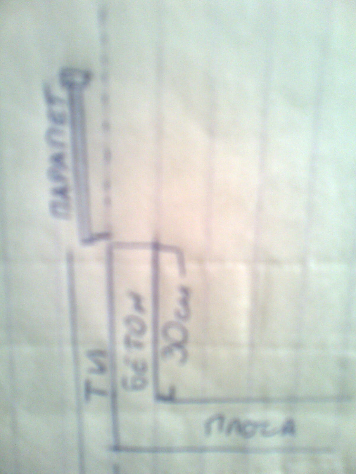 Извинявам се предварително за смотаната скица. Парапета ще е на тераса като трябва да се монтира на бетонен бордюр с дебелина 12см. и височина 30-тина см. Казвам неточен размер за височина защото не е нивелиран бордюра. До тук нищо сложно,изискването е парапета да бъде разположен не над тези 12 см. ширина а извън тях с идеята след време върху тези 12 см да се монтира дограма и парапета да остане от външната страна. Бордюрът пък от външната страна ще бъде облечен с 10см изолация понеже е в една равнина с фасадата. Начина по който аз си го представям е с Г образно заварени профили които да се захванат с анкери и на тях да се захванат краката на парапета. Дано някой ме е разбрал