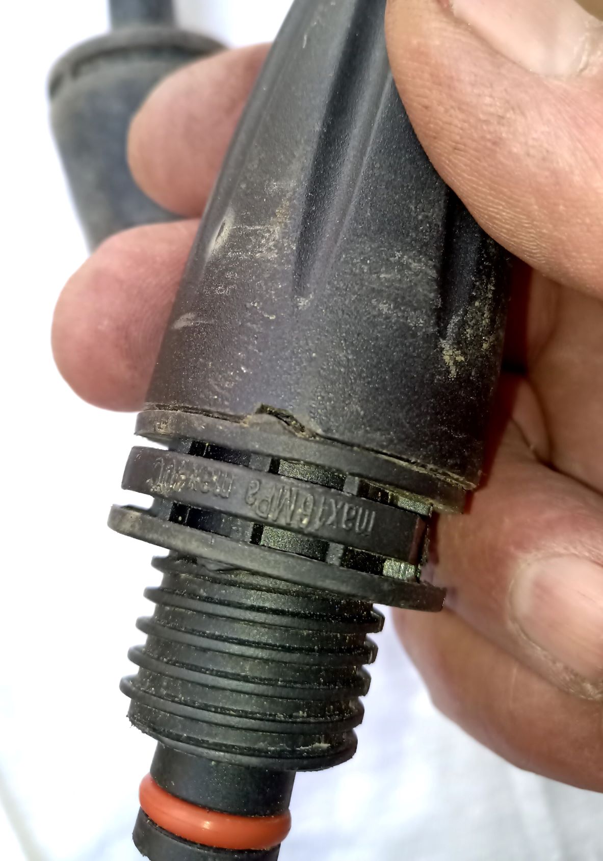 Ето ти и основната дюза в цял вид дето ти обяснявам че е като тръбичка. На завихрящата дюза /зелената пластмаска/ както виждаш почти няма следи от износване къде е контактувала съчмата въпреки че в нормално състояние те се допират много лекичко. Това е така защото като се вдигне налягането и водата я избутва на пред и я уплътнява към отвора от пред на външния корпус.