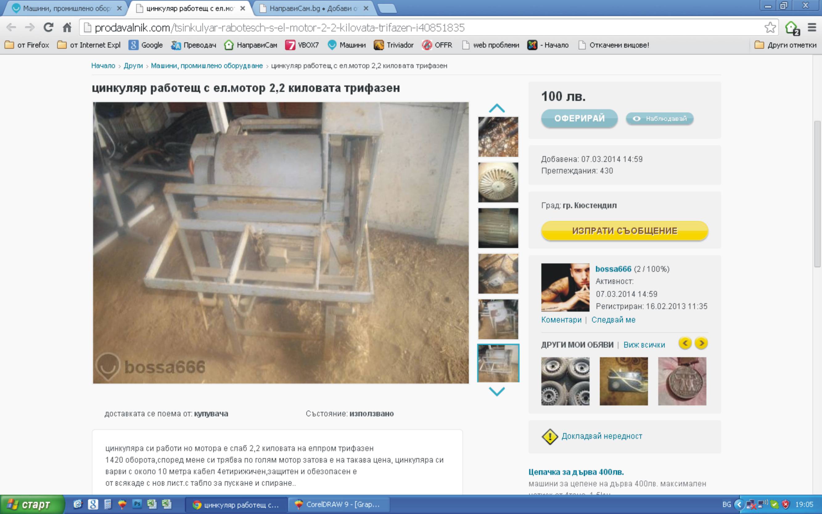 Това http://prodavalnik.com/tsinkulyar-rabot ... -i40851835 - мотора и пускателя само струват толкова. Железата диска и кабела идват бонус.