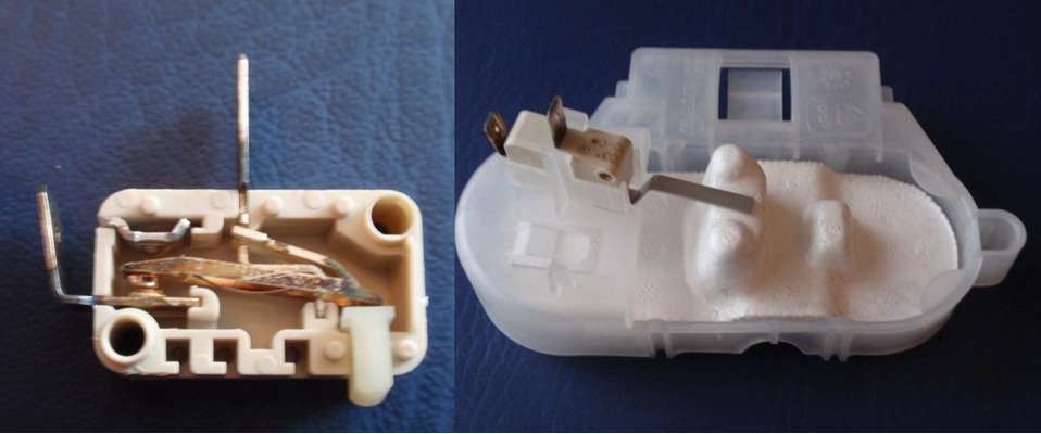 Проверих и датчика за преливане. Явно идеята му е като се понапълни ваничката на дъното (то аз доста се чудех защо е тази кора на дъното ), та като се понапълни стиропорения поплавък да прекъсне веригата на превключвателя. При замер на превключвателя мултицета показа съпротивление, та го позачистих с контактен спрей. Направих проба с мост на клемите за сензора против преливане и машината тръгна за пробата. Поставих почистения сензор и пак грешка 30. Сложих моста и пак грешка 30.