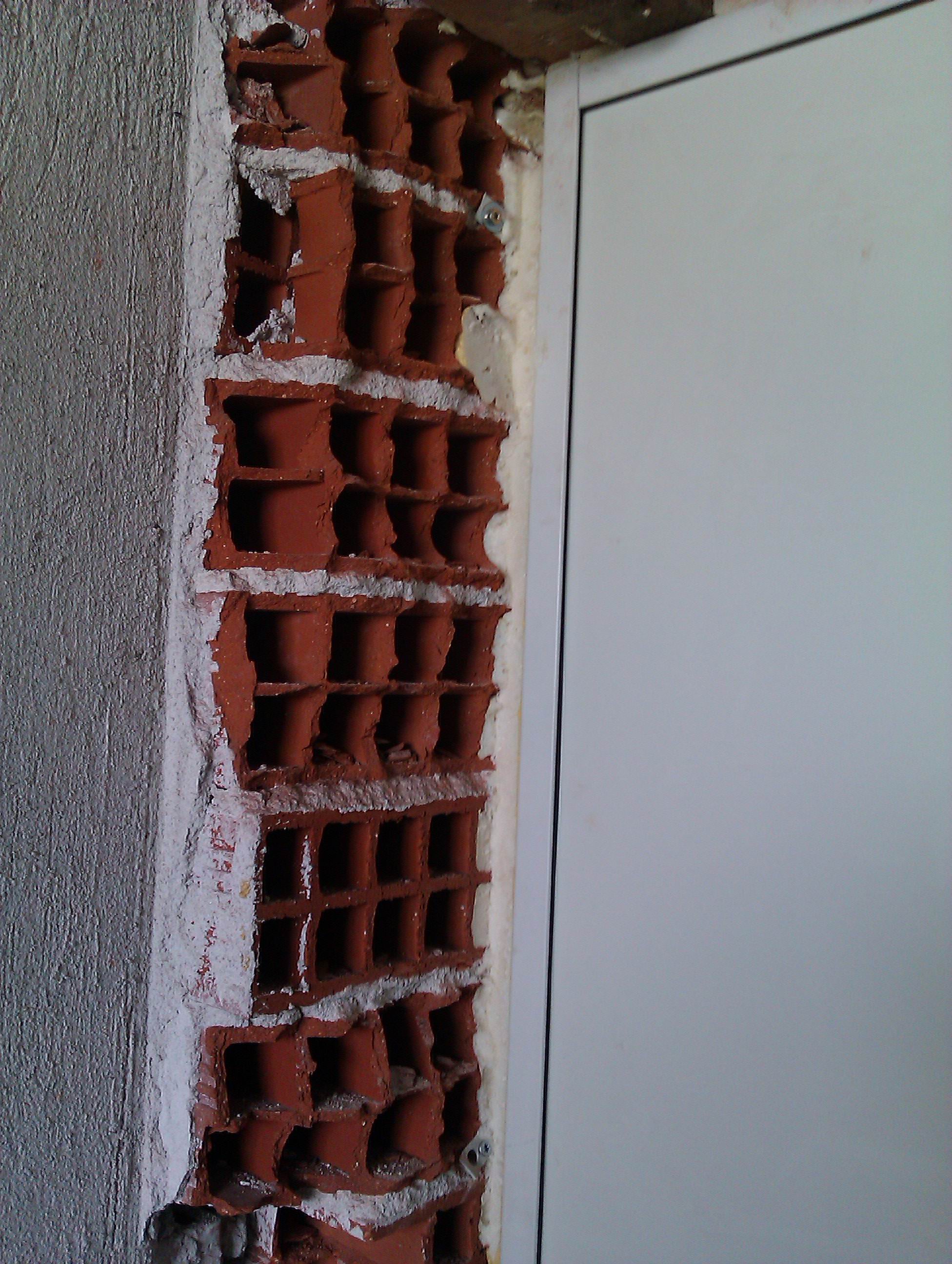 Материалите които ти трябват са гипскартон, по добре импрегниран 12мм, лепило за гипскартон ,стъклофибърна или хартиена лента ъглопротектори и накаква шпакловка.Режеш ивици с ширина колкото е изкъртената част ,напръскваш тухлите с вода ,слагаш от лепилото топки на ивиците гипскартон и ги залепяш. Предварително си ги наложи за да видиш как пасват и колко лепило ще им трябва .Трябва да са под прав ъгъл спрямо вратата и "на нивел" във височина.Първо страничните ,после горната ,прецени ако трябва доизкърти на места тухлите още, ако ти надигат и ивиците покриват много вратата, няма нужда да я застъпват с повече от 5 мм.Остави фуга 2мм между ивиците и вратата, която после запълни с акрилен силикон,накрая шпакловай с някаква циментова шпакловка дори и едра да е ,там гледам че е на мазилка.