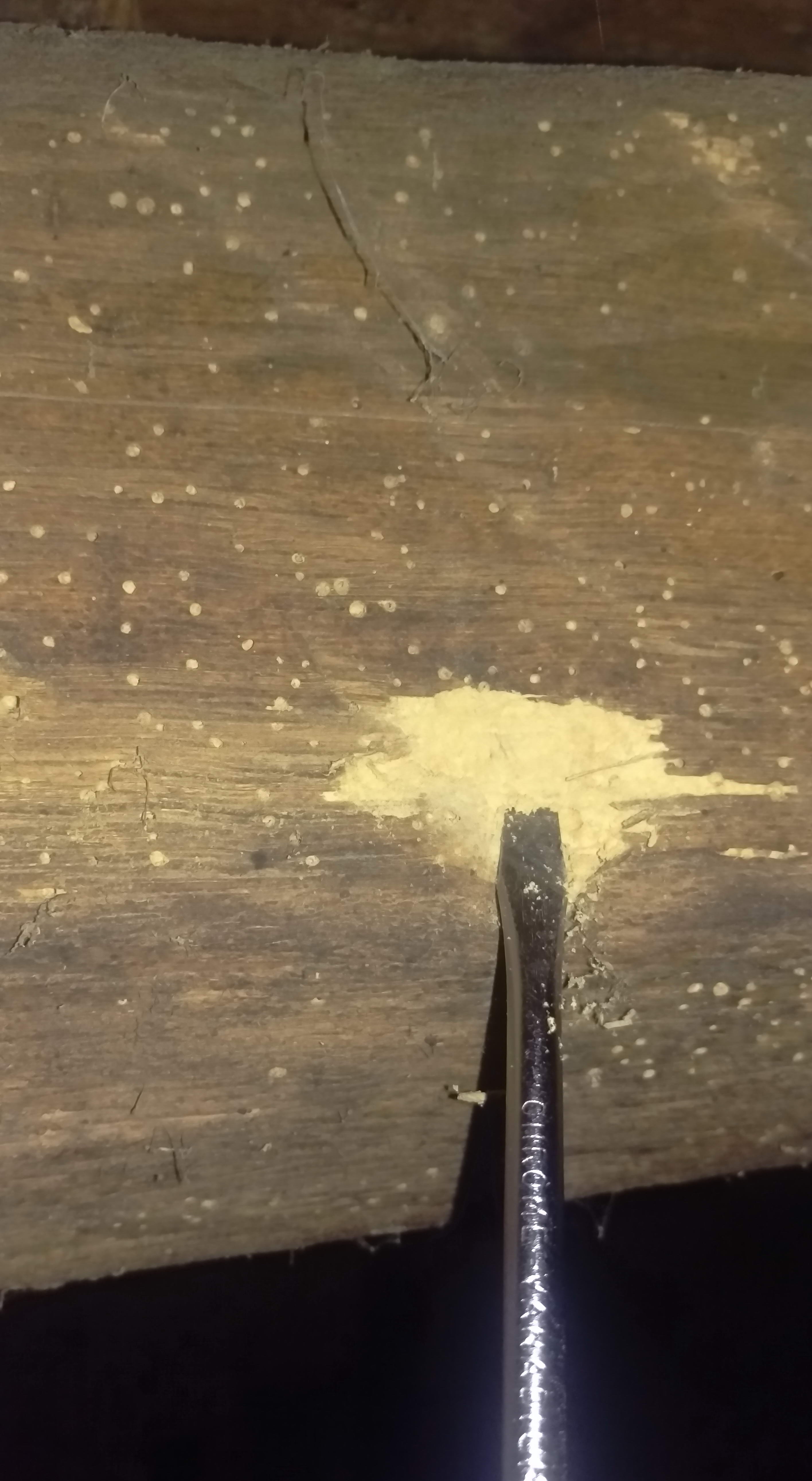 От едната страна на дървото е разрушеното от другата няма изобщо. Не съм чувал скърцане и гризене от дървояди. Няма стърготини по пода, може да са стари следи, чудя се да не е от влагата или и от двете и само с почистване и стретиране с BOCHEMIT дали ще стане? Някакви импрегнатори върху това BOCHEMIT Plus дали са възможни. Гредите не са третирани с нищо.