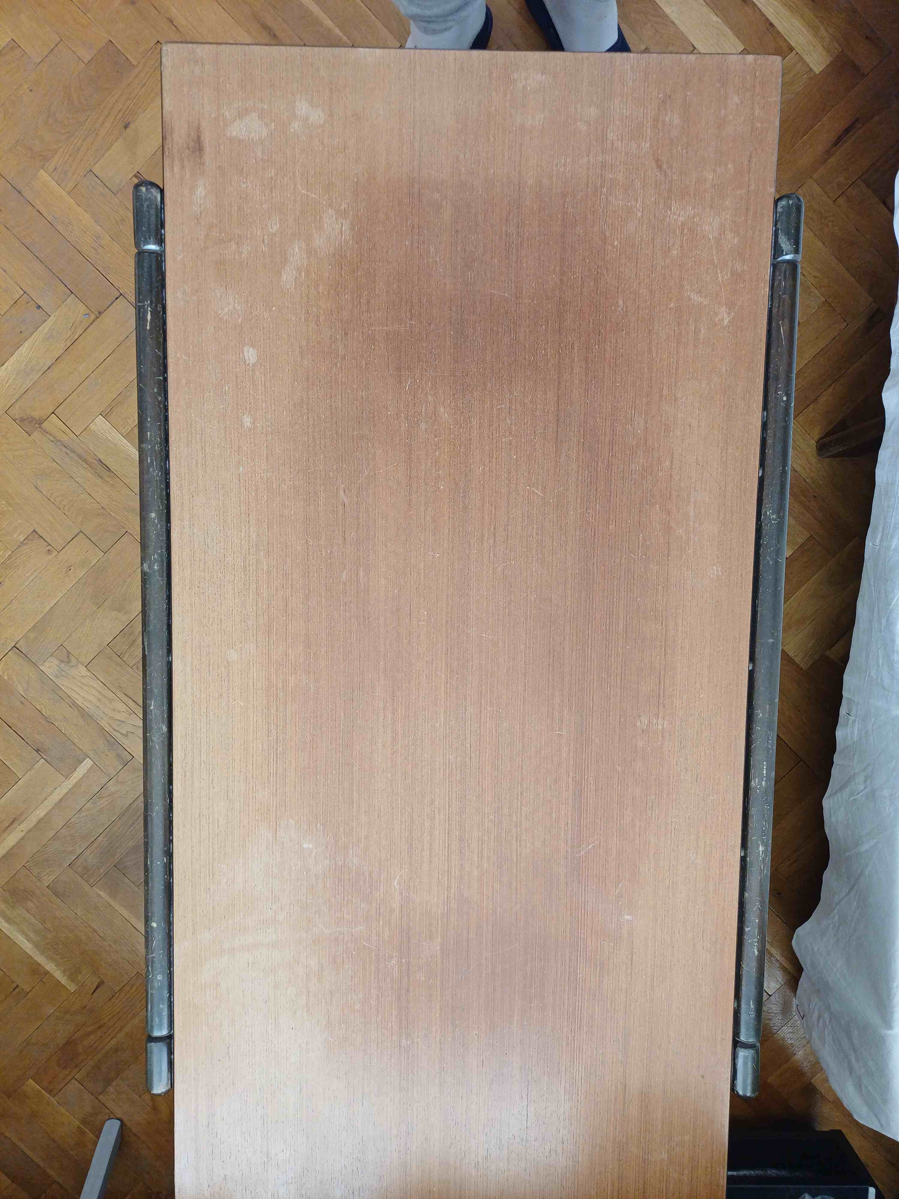 Конструкцията е много стабилна, няма никъде проблем, но самите повърхости са доста похабени от слънцето и експлотацията. Има драскотини по плота и краката. Състои се от два плота, като горния някога е бил кафяв, а долния и краката са били черни.